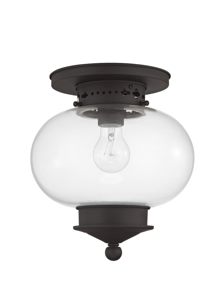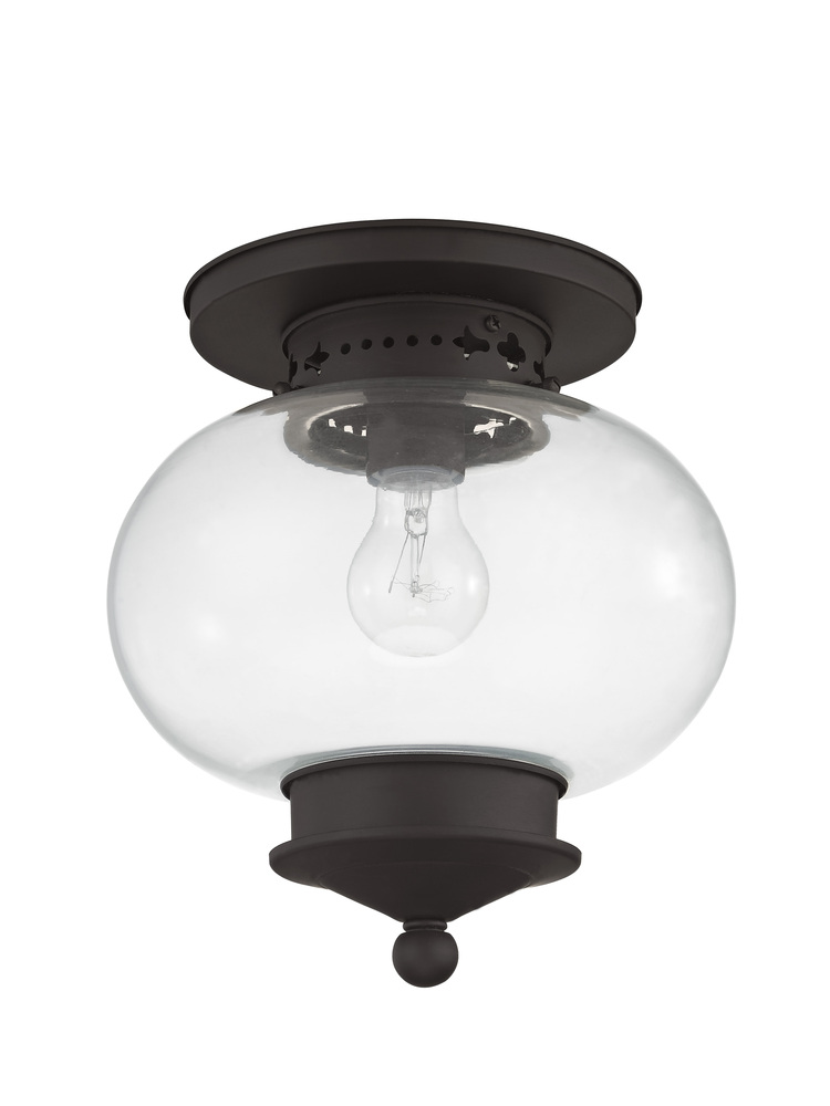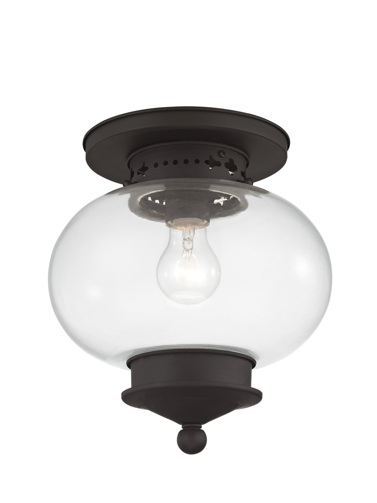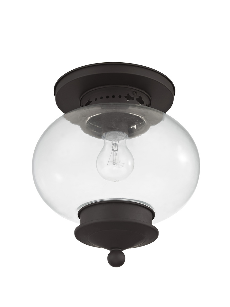 This Elegant Solid Brass Flush Mount From The Harbor Collection Will Add A Warm Glow To Any Living Space. It Features A Bronze Finish Embellished With Decorative Etched Metal Details And Hand Blown Clear Glass.