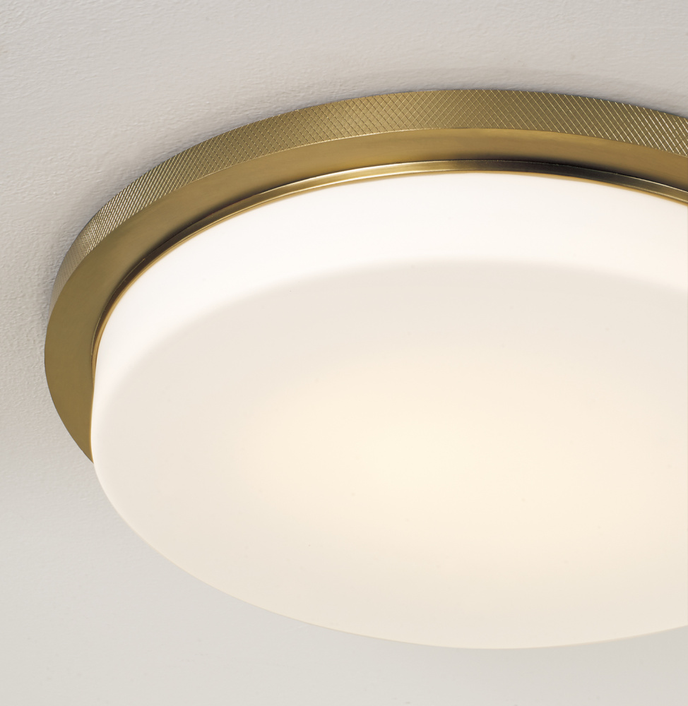 DETAILS: Surrounded by an elegant Aged Brass band with subtle knurled texture, the Soft White glass diffuser brings an ambient glow to any space. Complete with integrated LED technology for maximum impact in a low profile silhouette.