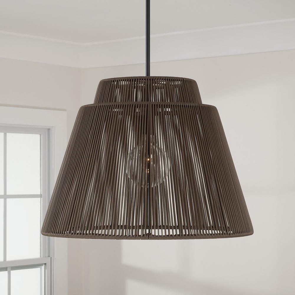 Purposefully crafted for interior and exterior spaces, the Jasper Indoor/Outdoor Pendant seamlessly blends durable design with high style. The weather-resistant hand-wrapped resin delivers a moody aesthetic in dark Umber brown, while the Matte Black finish gives a nod to modern style. Rated for Damp Locations and backed by our one-year warranty.