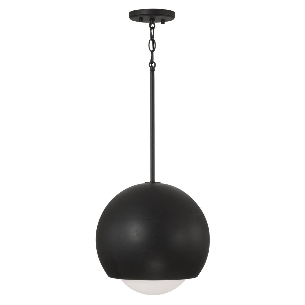 The streamlined Dolby 1-Light Pendant evokes retro chic style with Soft White glass encircled by the metal globe shade. The textured Black Iron finish creates dimension and punctuates any space.