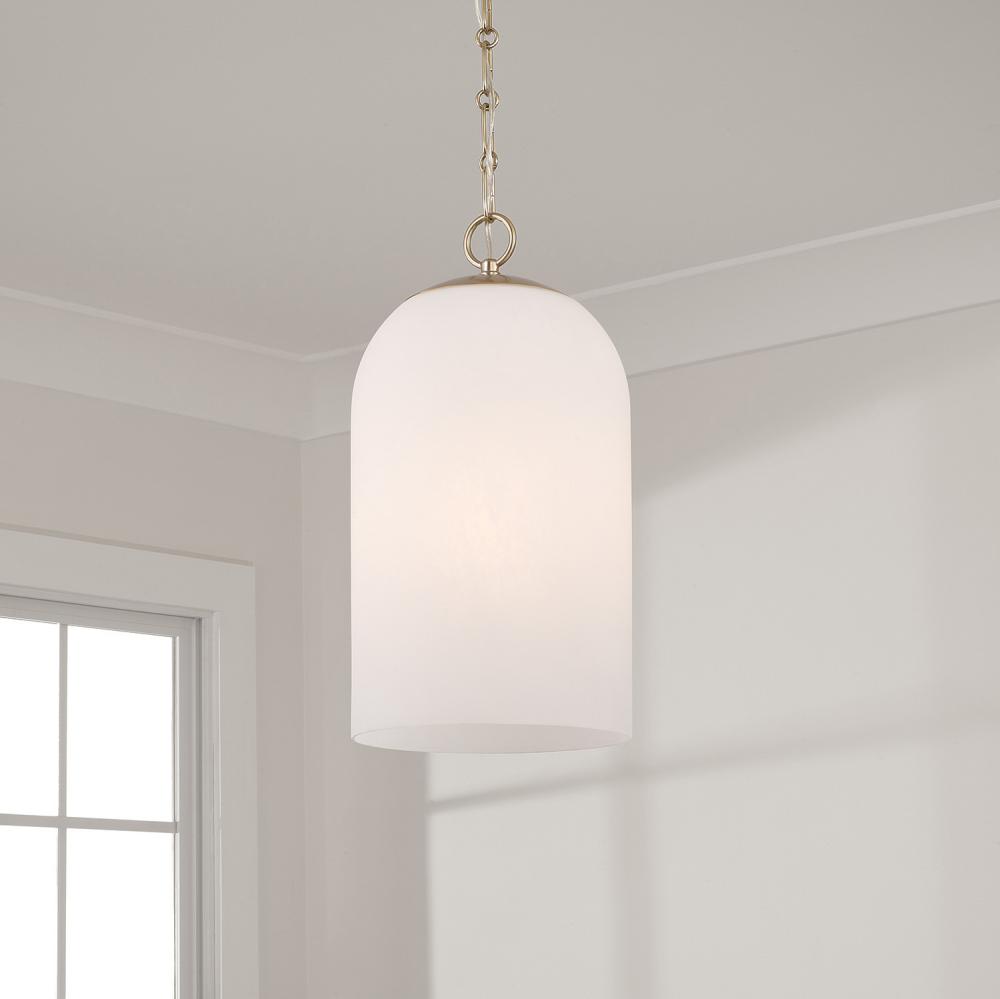 DETAILS: Faux Alabaster glass creates a unique, ambient glow that's enhanced by the Matte Brass shine and designer chain.