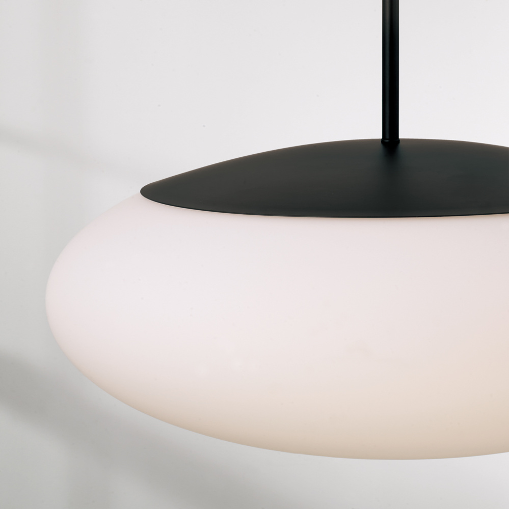 Create a serene aesthetic with the Soren Pendant. The Soft White glass oval illuminates a harmonious, ambient glow, while the Matte Black finish perfectly punctuates the crisp lines and sleek details. Open on the bottom for easy lightbulb swaps.