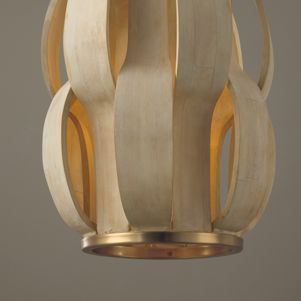 The Willa Medium Pendant artfully brings the outdoors in. Artisan crafted pieces of Bleached mango wood create alternating curves on the drum silhouette, giving glimpses of illumination from within. The Matte Brass finish offers a warm shine, bringing a beautiful balance to this unique, structural luminaire.