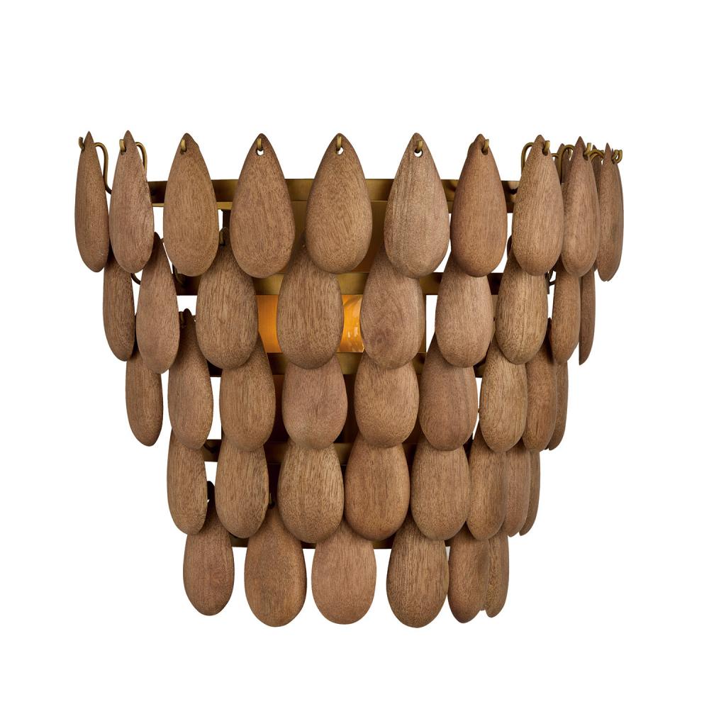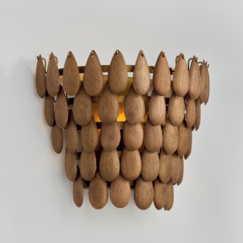 Adorned with handcrafted mango wood in a captivating cascading silhouette, the Ravi Sconce delivers artisan elegance with intriguing dimension. Intricately placed, the wooden teardrops offer glimpses of light from within, while the hand-distressed Patinaed Brass adds lustrous shine to the enchanting luminaire. Natural variation makes each piece unique.