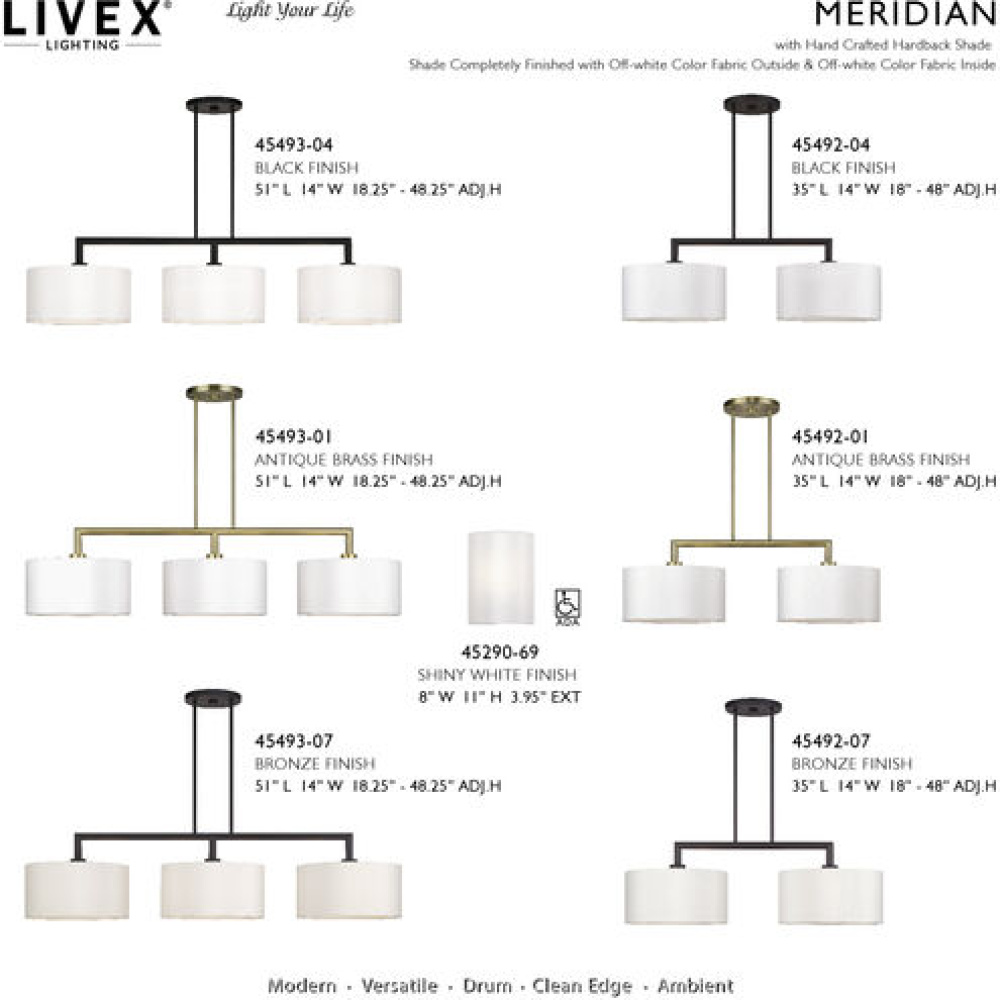 Ready to accommodate any contemporary backdrop – and perfect for hospitality settings – the extensive Meridian lighting collection offers dozens of models in a wide variety of sizes and finishes. Timeless in their simplicity and versatility, the drum shape Meridian luminaires provide warm and welcoming ambient lighting. Completely finished with fabric inside & out, these hardback shades provide extra soothing illumination.