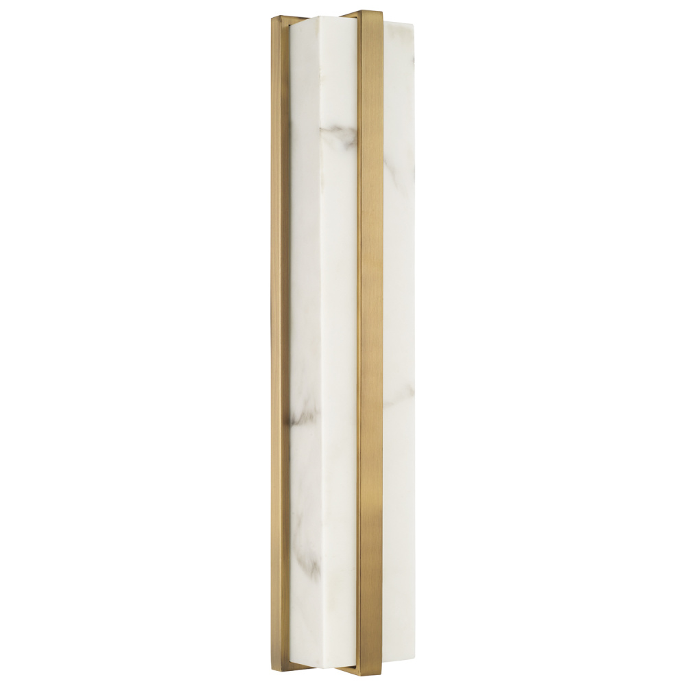 DETAILS: Streamlined and sleek, the rectangular form is crafted from Alabaster Glass with a full length Aged Brass backplate and band, plus integrated LED technology.