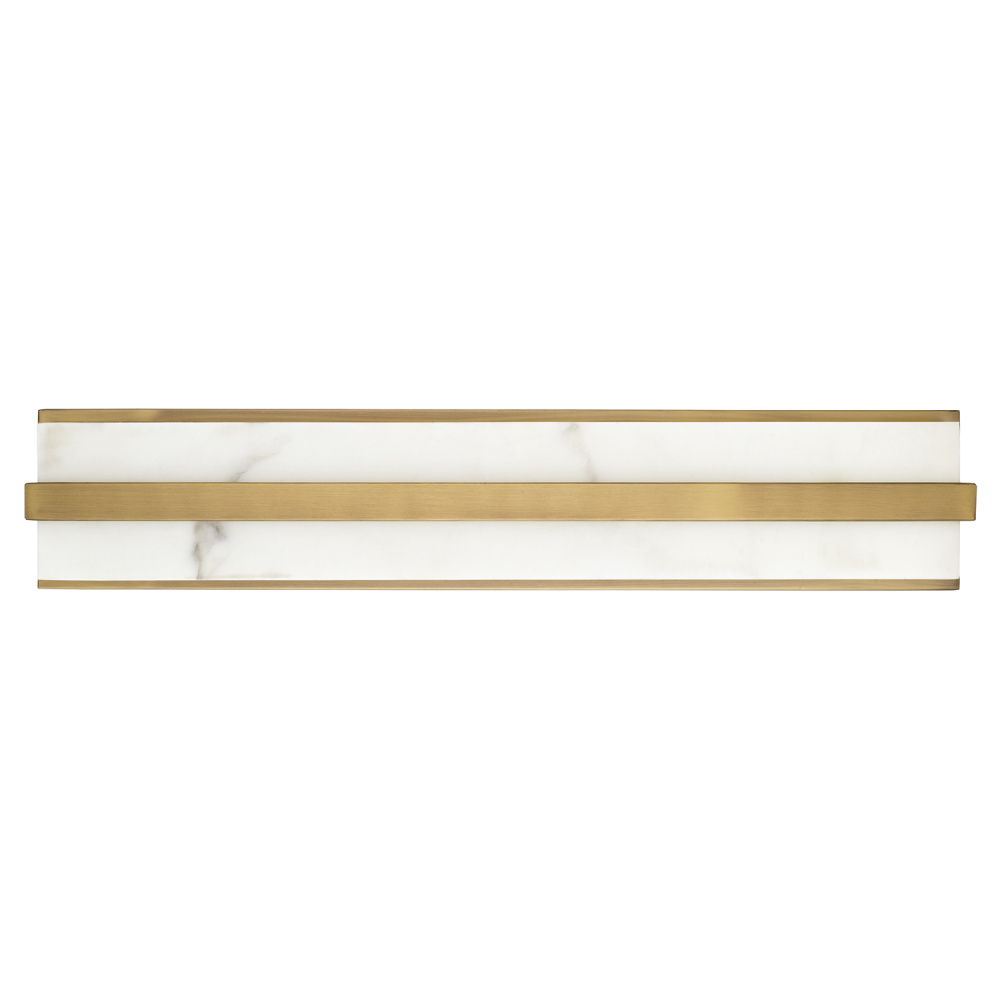 The Noah Vanity exudes streamlined sophistication in a sleek, rectangular form. The hand-crafted Alabaster composed Glass pairs with an integrated LED board to create this handsome luminaire. With maximum impact that meets ADA standards, the fixture includes a full-length Aged Brass backplate and a matching strike-through band across the front.
