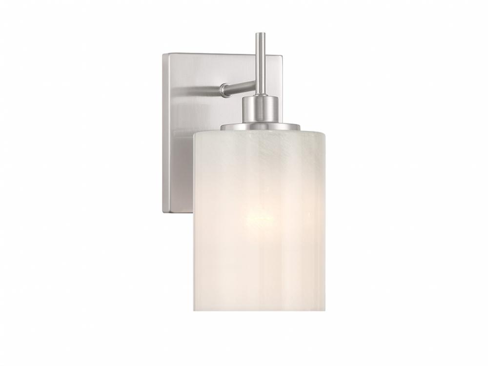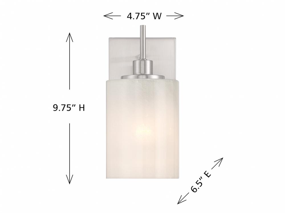 Pep up any room with this simply beautiful 1-light sconce! Its centerpiece is a shade of strie glass featuring dazzling swirls that draw the eye, soften the glow and work beautifully with the Brushed Nickel finish. It is 9.75" in height, 4.75" in width and extends 6.5" from the wall. Uses 1 standard size bulb of up to 60 watts. Bulb not included.