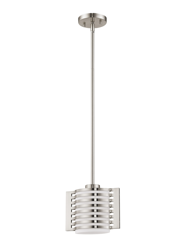 Combine A Modern Style With A Bold Aesthetic By Adding This Designer, Brushed Nickel One Light Mini Pendant To Your Home. Sleek Brushed Nickel Surround A Satin Opal White Glass, Creating A Dimensional Look And Feel.