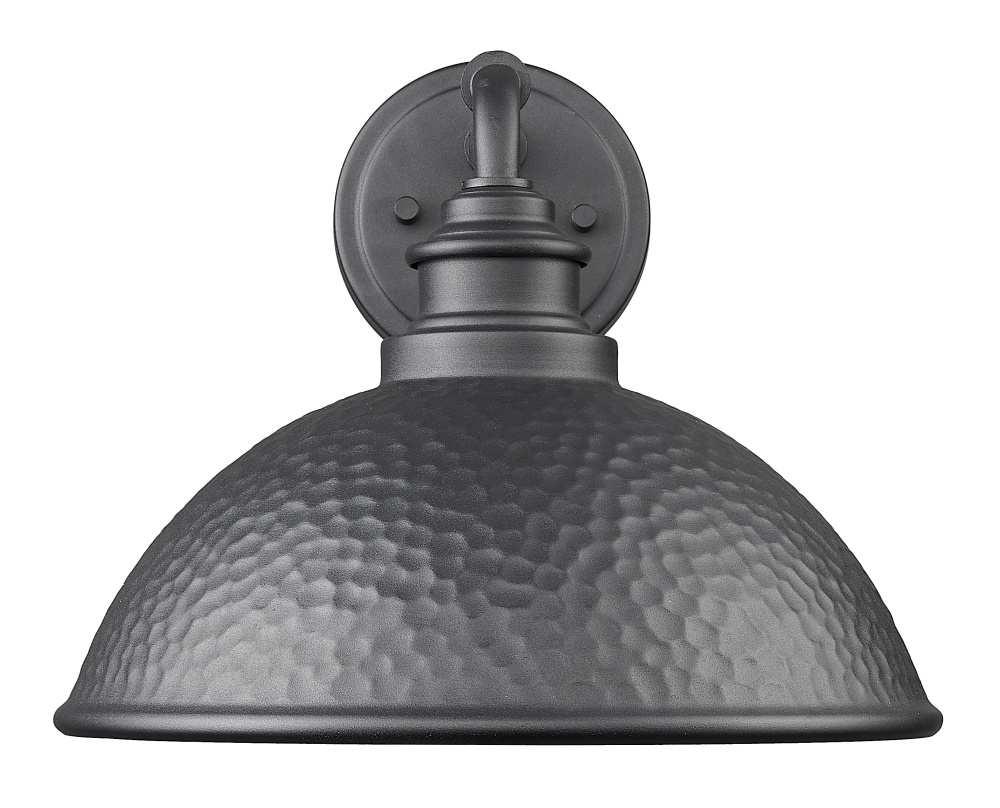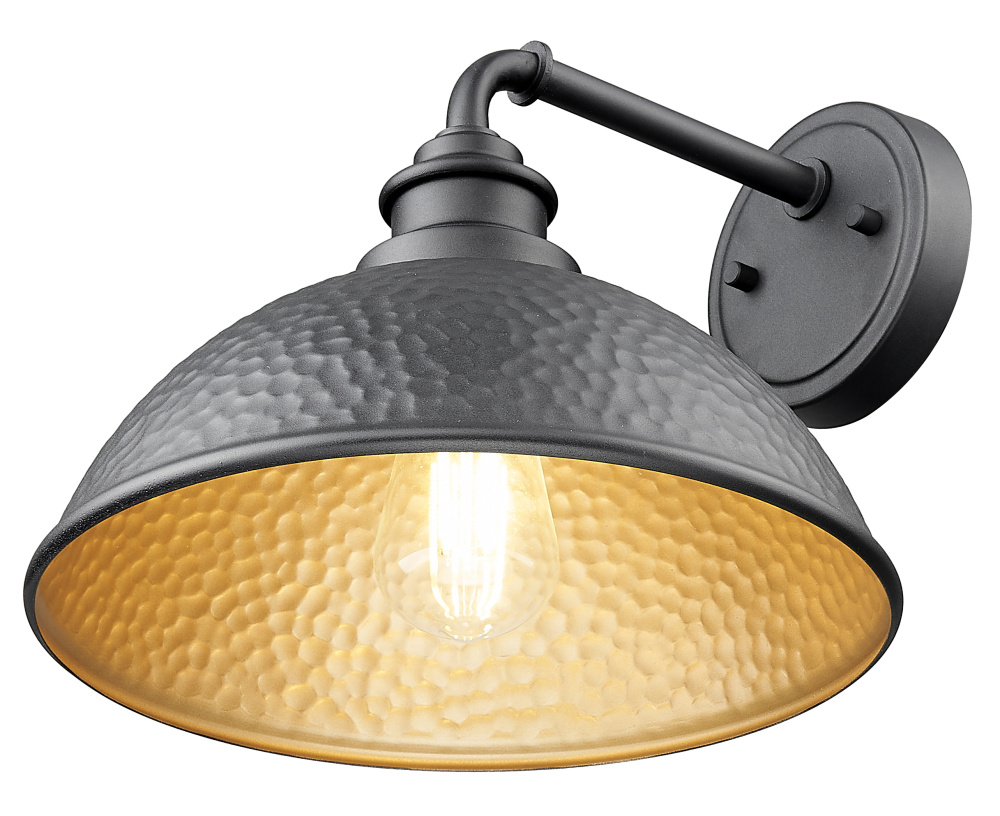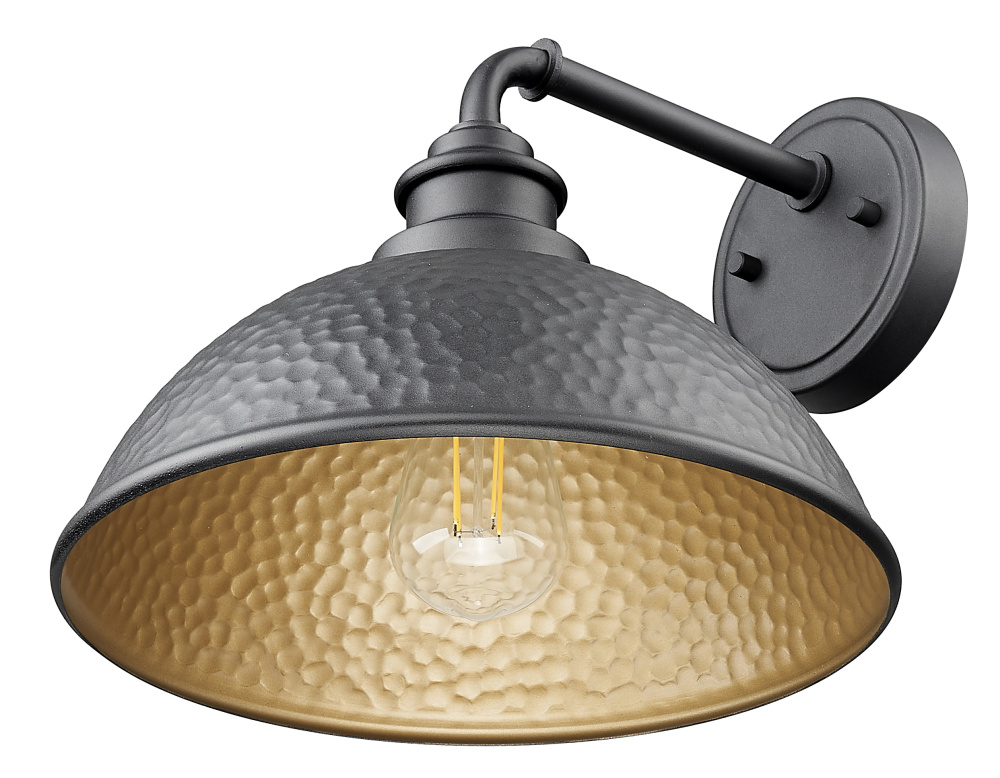 From Acclaim Lighting, this outdoor wall light fixture offers a stylized farmhouse look for your home. It comes in a black finish steel frame, with hammered detailing and a dome shaped shade, that forms an eye-catching silhouette. Light nicely bounces off the inner painted gold finish.