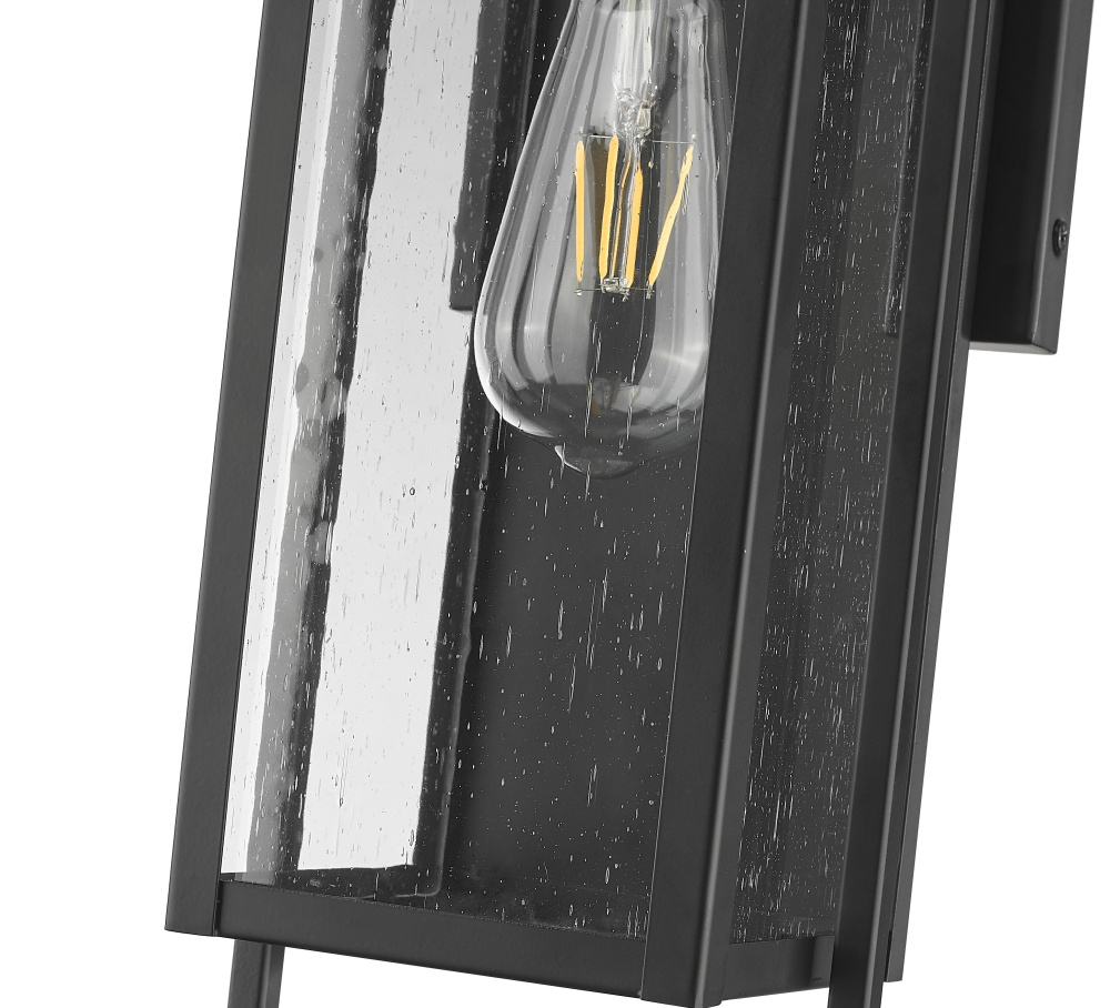 From Acclaim Lighting, this outdoor wall light fixture offers a stylized modern look for your home. It comes in a black finish steel frame, with clean, straight lines and intersecting rectangles that form an eye-catching silhouette. Clear glass panels give a full view of the bulb used within, making decorative light bulbs a smart choice for this fixture.