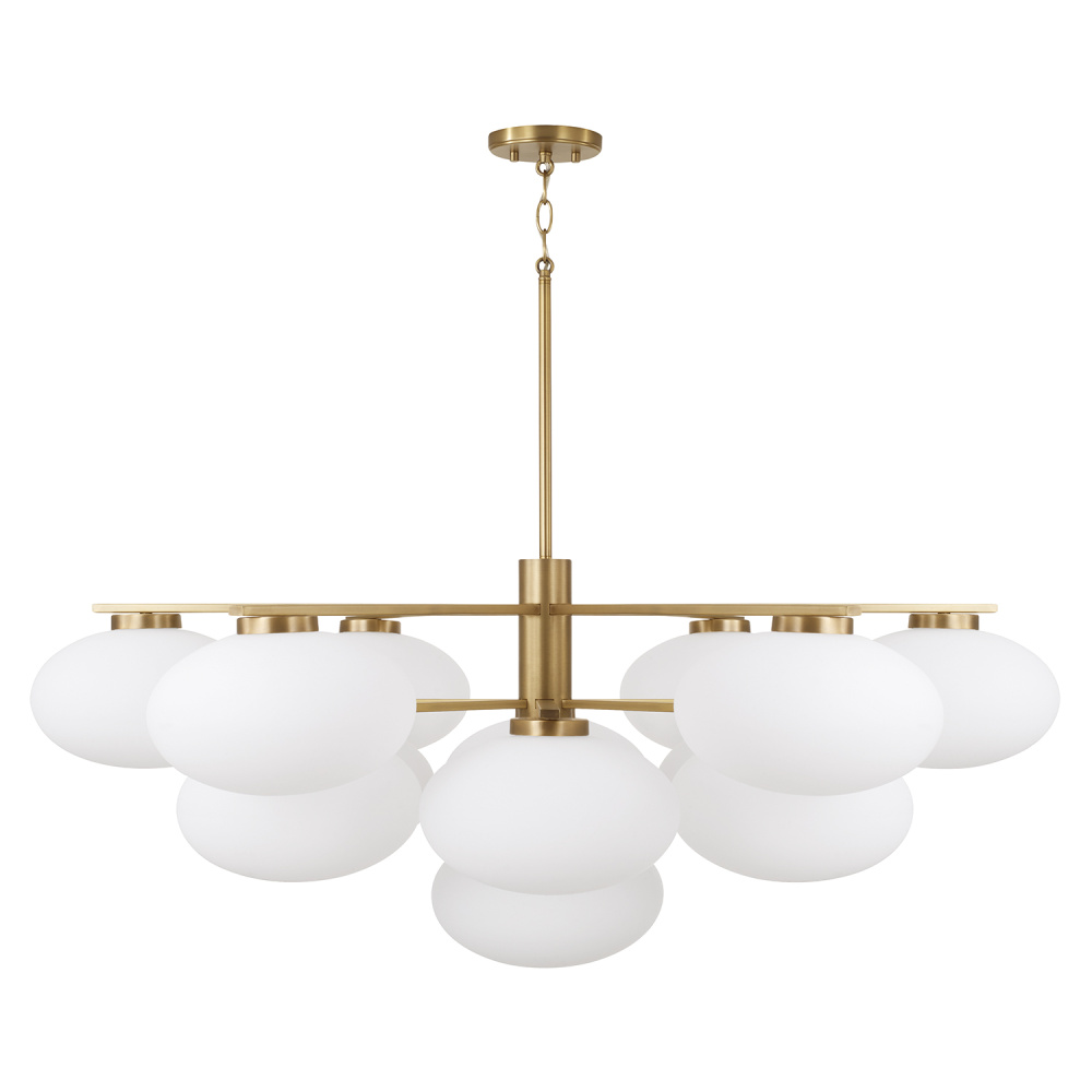 Create a serene aesthetic with the Soren Two-Tier Grand Chandelier. Appearing almost weightless, the Soft White glass ovals illuminate a harmonious, ambient glow. The Aged Brass finish perfectly punctuate each piece with crisp lines and sleek details.