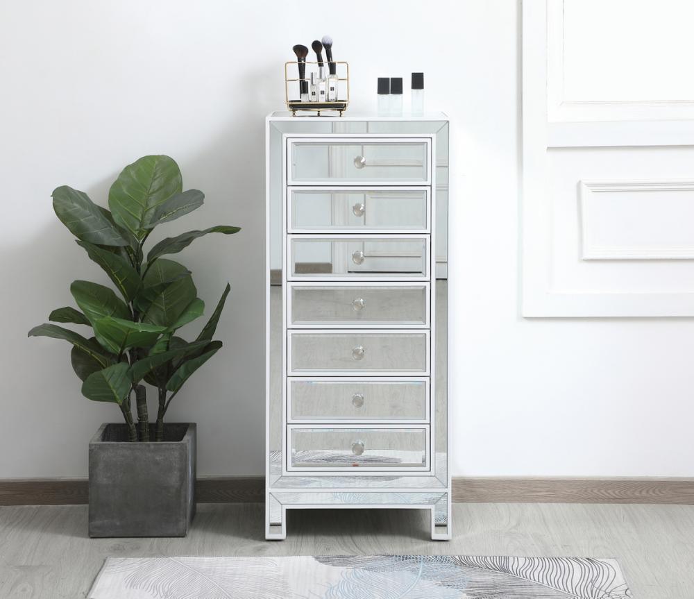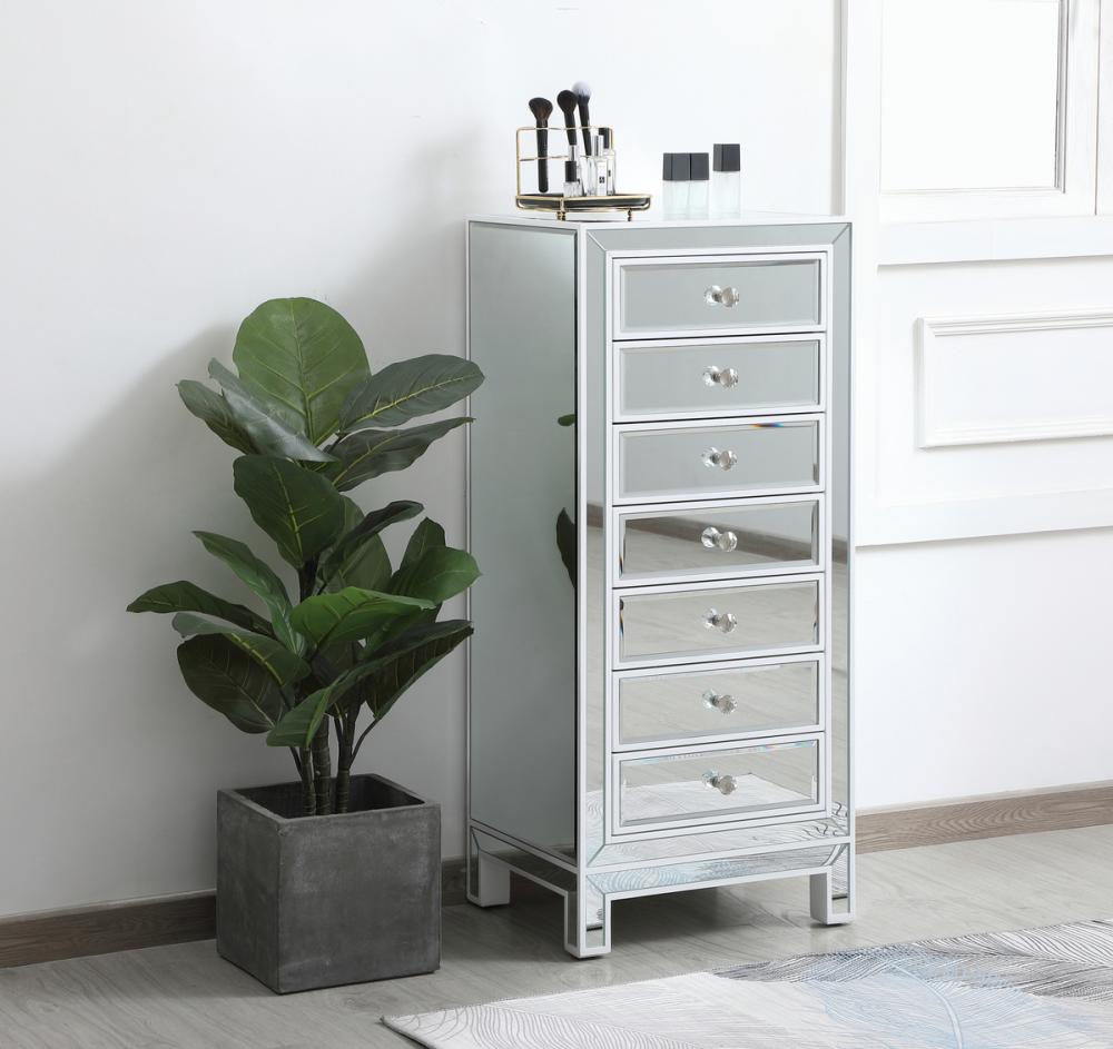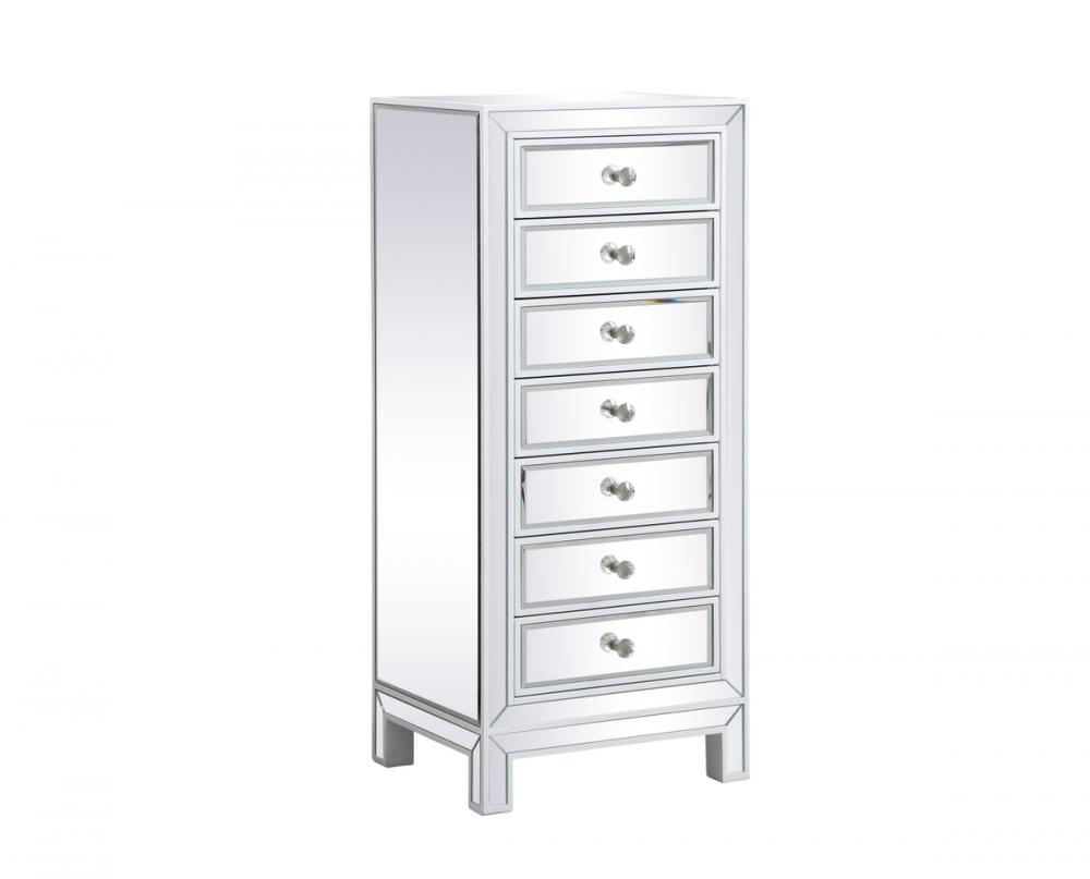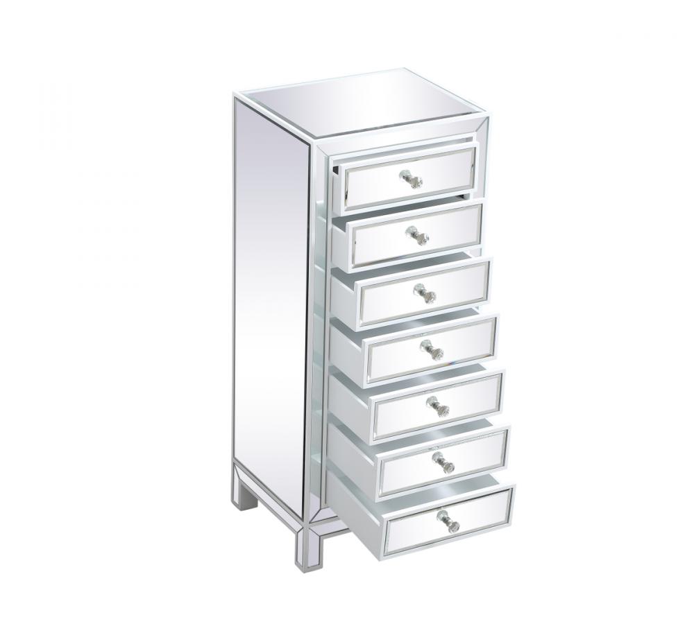 Enhance your bedroom or walk in closet with this fabulous and sophisticated lingerie chest! You can also store your intricate belongings in this petite 7 drawer chest. Dramatic and sophisticated, it has a hand painted finish border, beveled mirror panels on all surfaces, sparkling crystal drawer knobs, and mitered corners.
