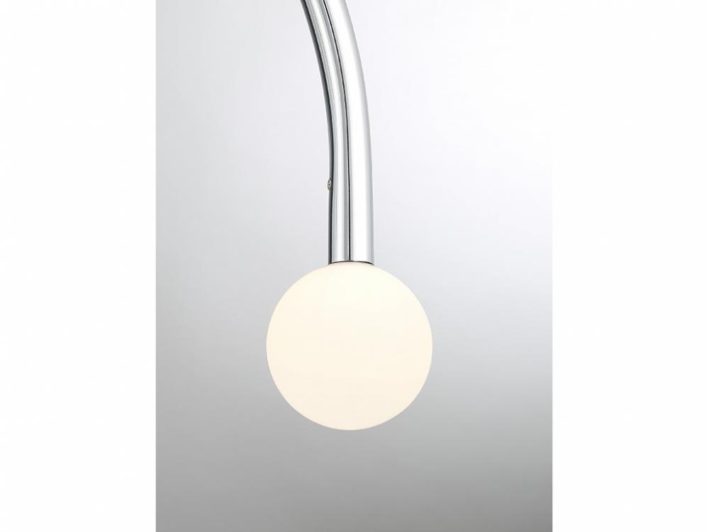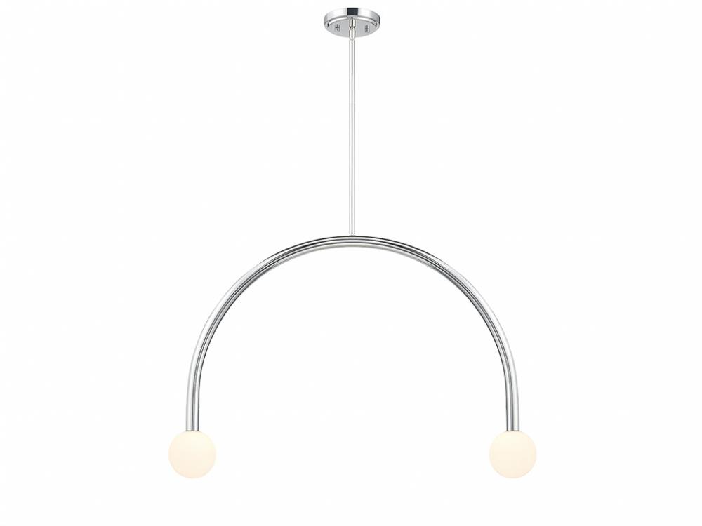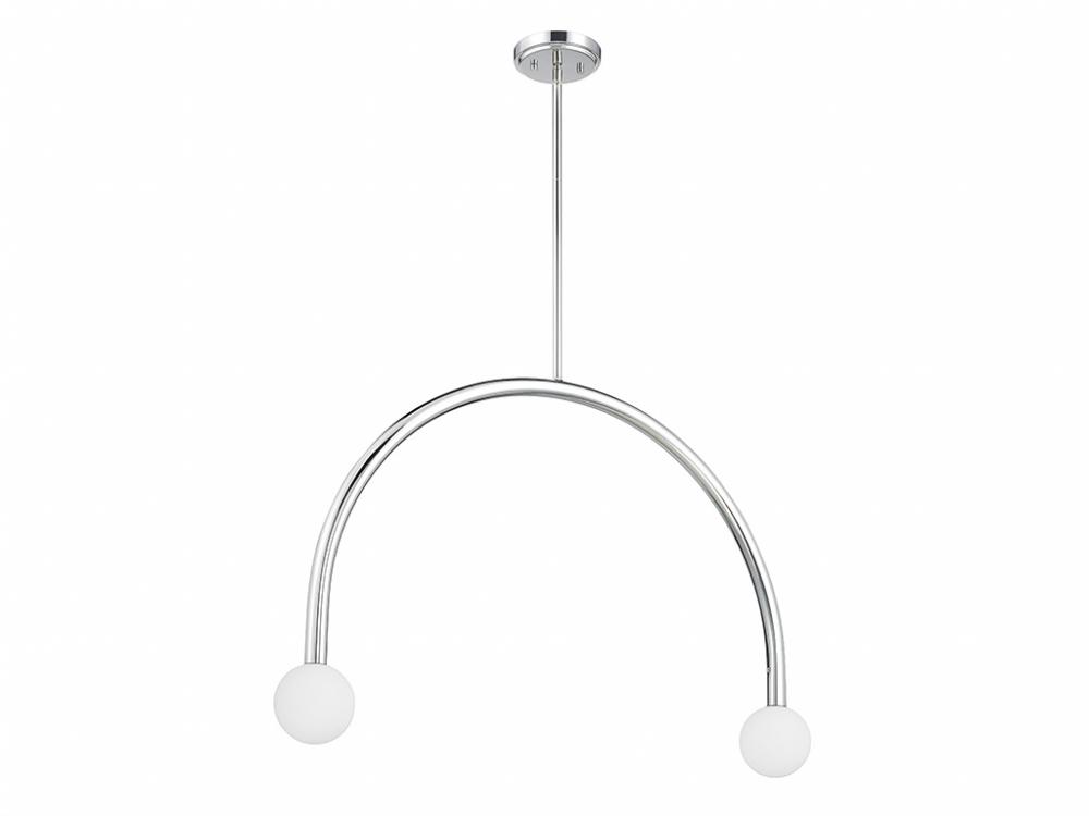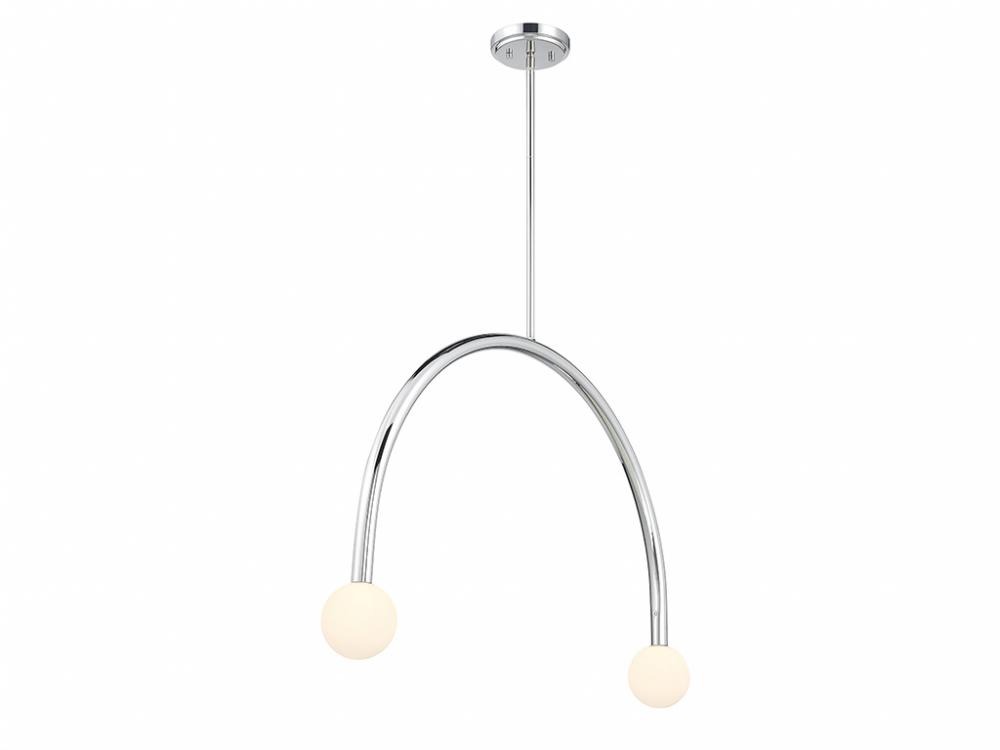 This perky, peppy 2-light chandelier has a curving style that makes a big impact! The light shines from inside orbs of white opal glass and the Chrome finish works beautifully with any decor. This chandelier is 33.5" in length, 4" in width and has an adjustable height ranging from 21" to 75". It comes with four 12" downrods and one 6" downrod. Uses two G9 LED bulbs of up to 3.5 watts per bulb. Bulbs not included.