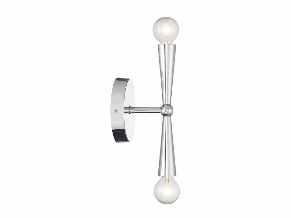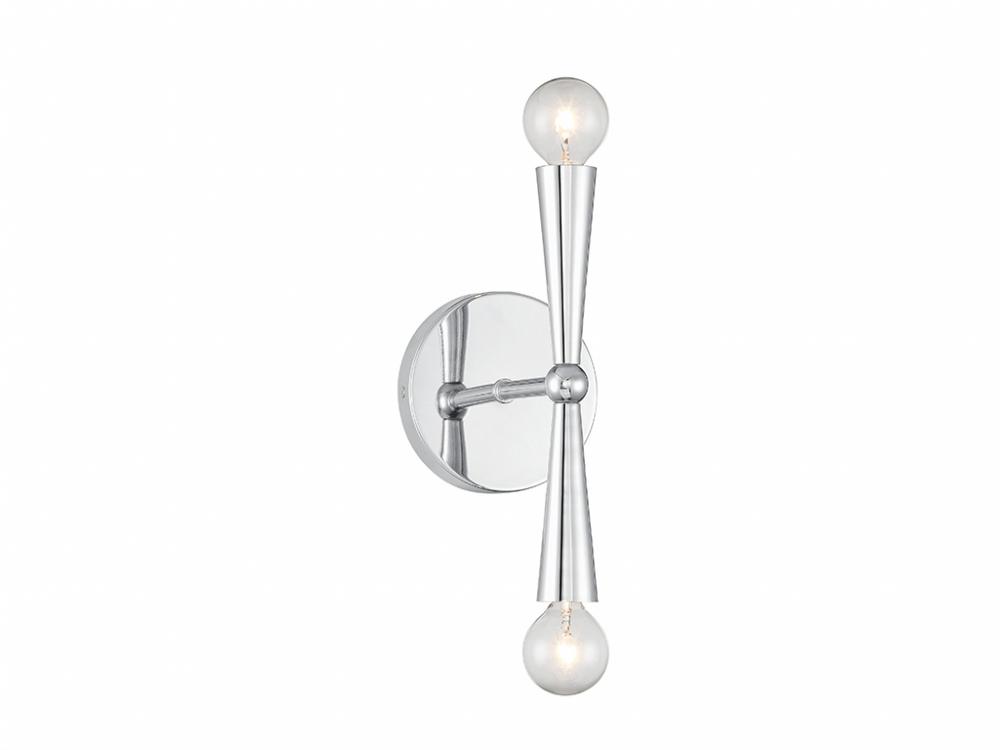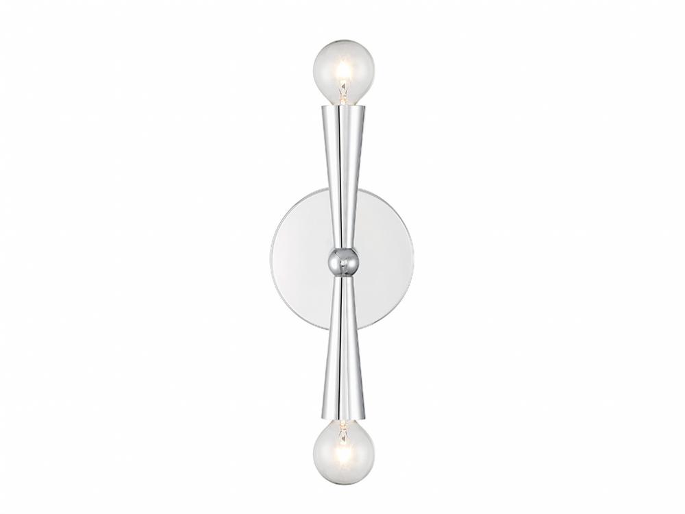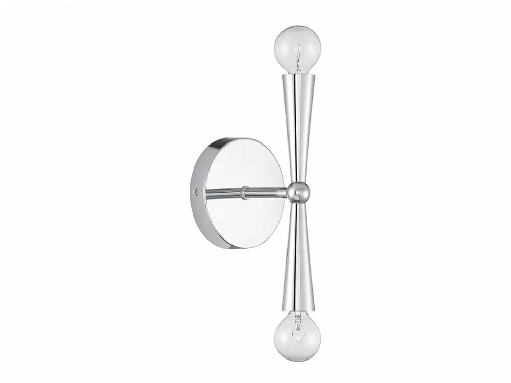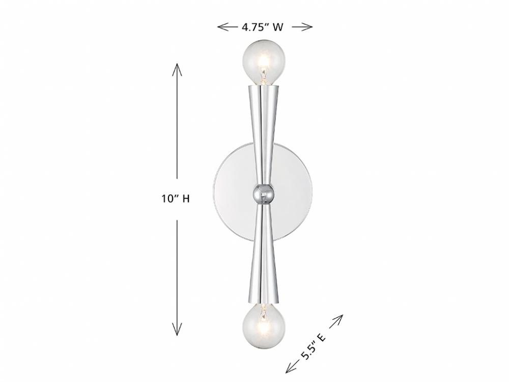 Make a scene with the unique silhouette of this 2-light sconce! Cone-shaped arms finished in Chrome burst forth from the center, bearing bare bulbs to let the light shine brightly. This sconce is 10" in height, 4.75" in width and extends 4.5" from the wall. Uses 2 candelabra size bulbs of up to 60 watts per bulb. We recommend using globe-shaped bulbs for heightened appeal. Bulbs not included.