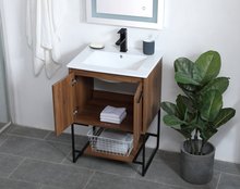 Live in modern comfort with this 24" walnut brown finish vanity. Dressed in a concrete grey and sleek black metal hardware, its contemporary style will have your bathroom or powder room elevated in industrial sophistication. The open shelf at the base and two doors reveal ample storage space for your bathroom essentials and miscellany. Clean lines create its own visual interest, adding trendy looks to your already chic room.