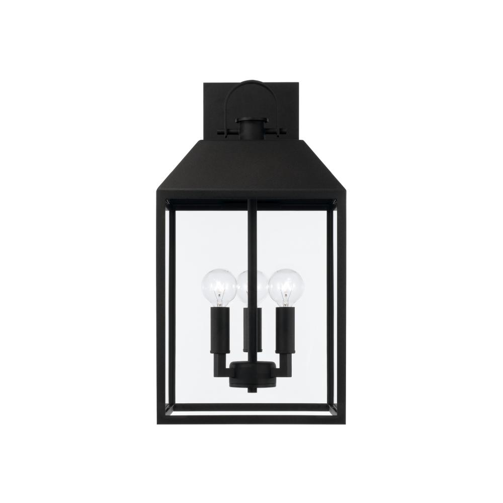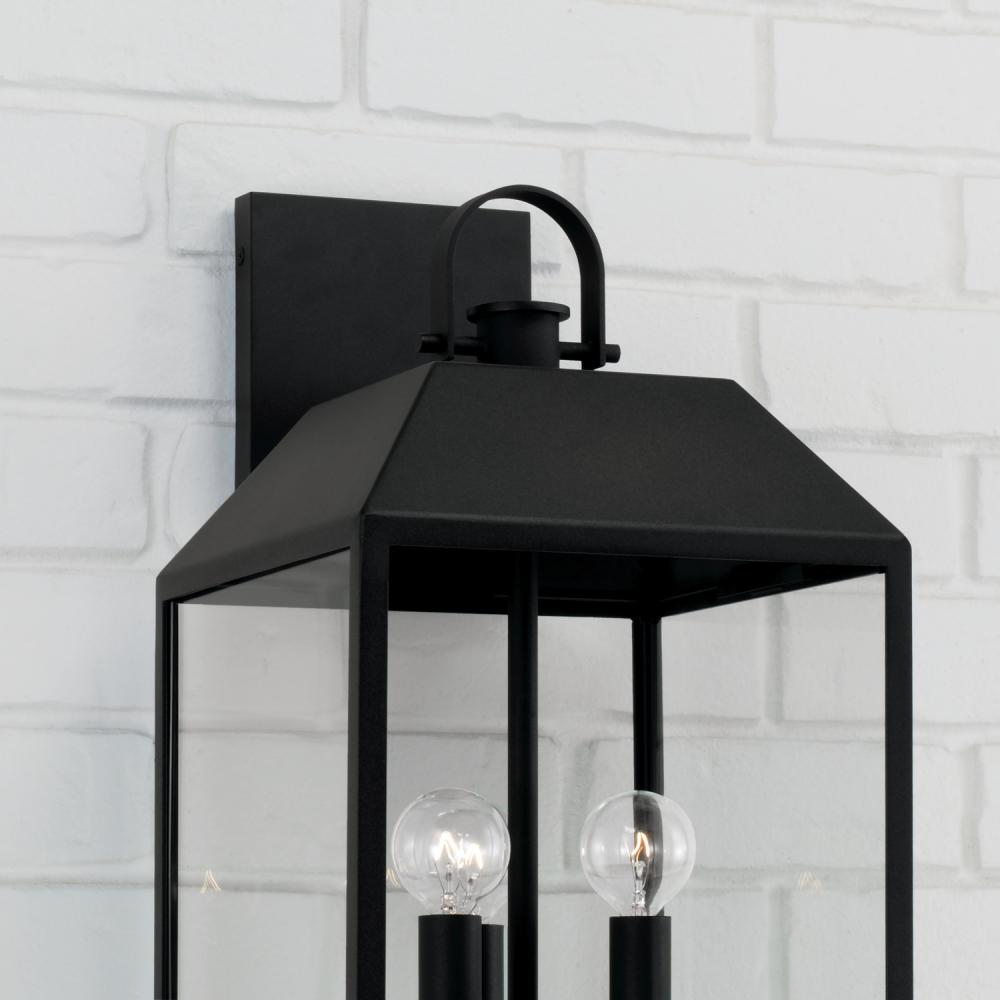 The Black finish punctuates the rectangular form, while the clear glass illuminates a warm welcome.