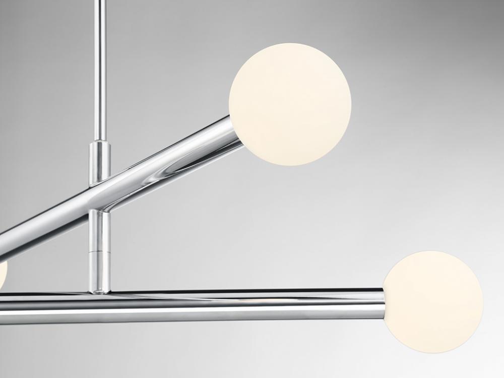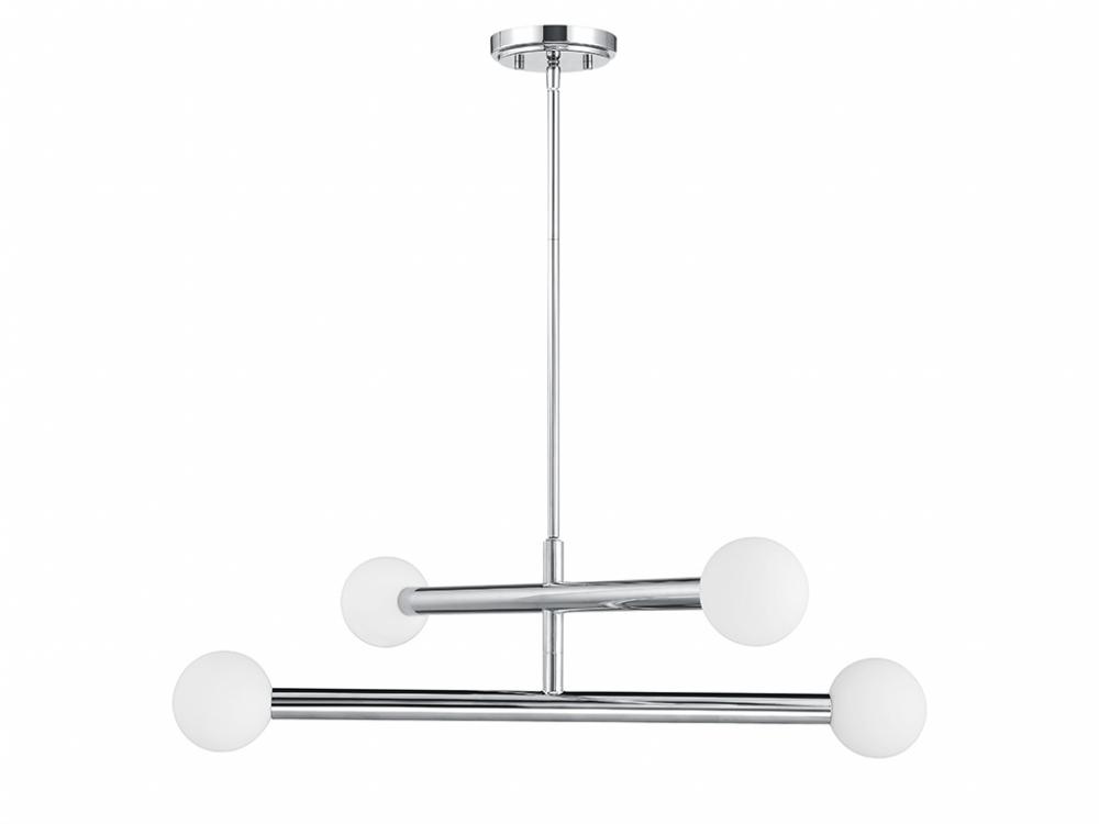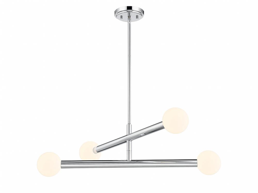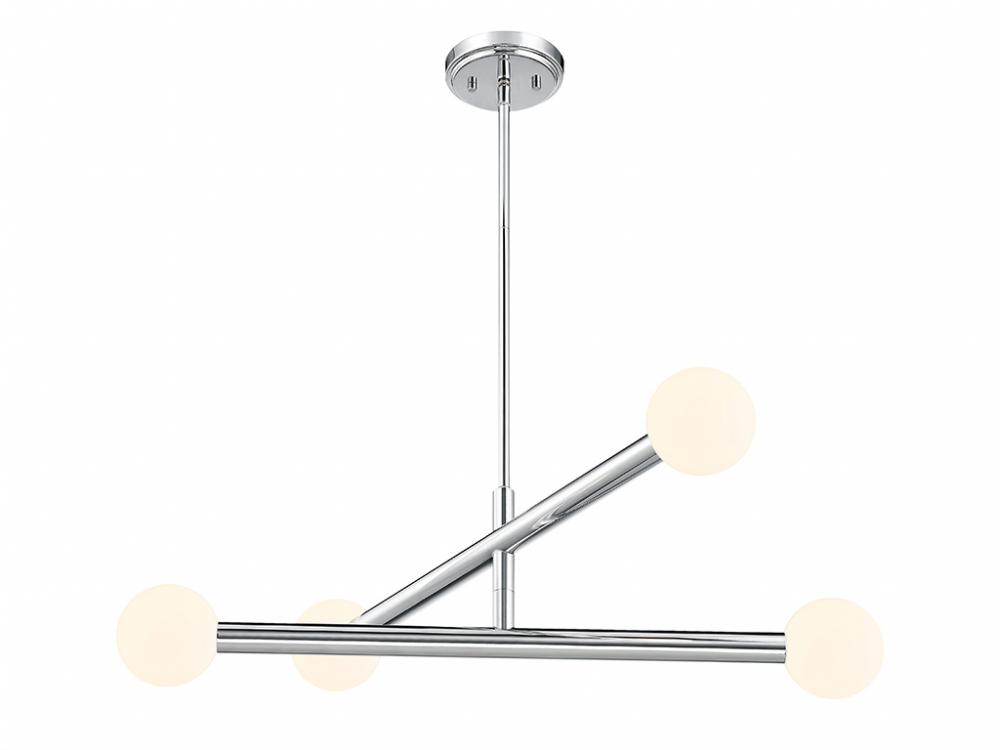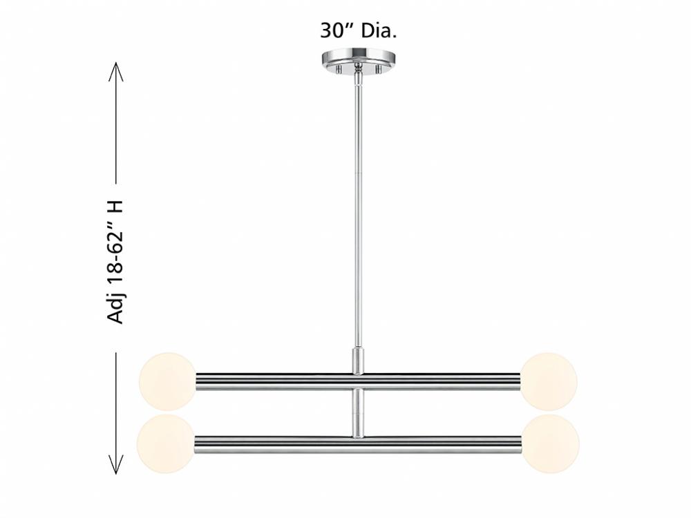 This perky, peppy 4-light chandelier has an understated style that makes a big impact! The light shines from inside orbs of white opal glass and the Chrome finish works beautifully with any decor. You can even rotate the arms for a customized look! This chandelier is 30" in width and has an adjustable height ranging from 8" to 62". It comes with four 12" downrods and one 6" downrod. Uses four G9 LED bulbs of up to 3.5 watts per bulb. Bulbs not included.