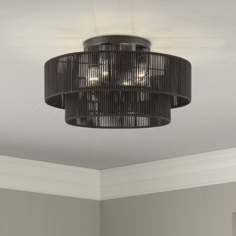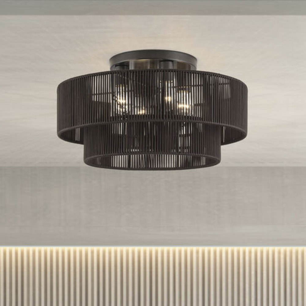 What a joy to come home to the calming, balanced and stylish Acordia lighting collection, with its semi-transparent texture and dynamic illumination! This midcentury modern lineup of elegant ceiling and wall lights features minimal metal frames with dimensional drum-shaped, tiered shades – masterfully handwoven with silky-smooth, highly-durable polyester rope, finished in noble, natural and atmospheric colors.