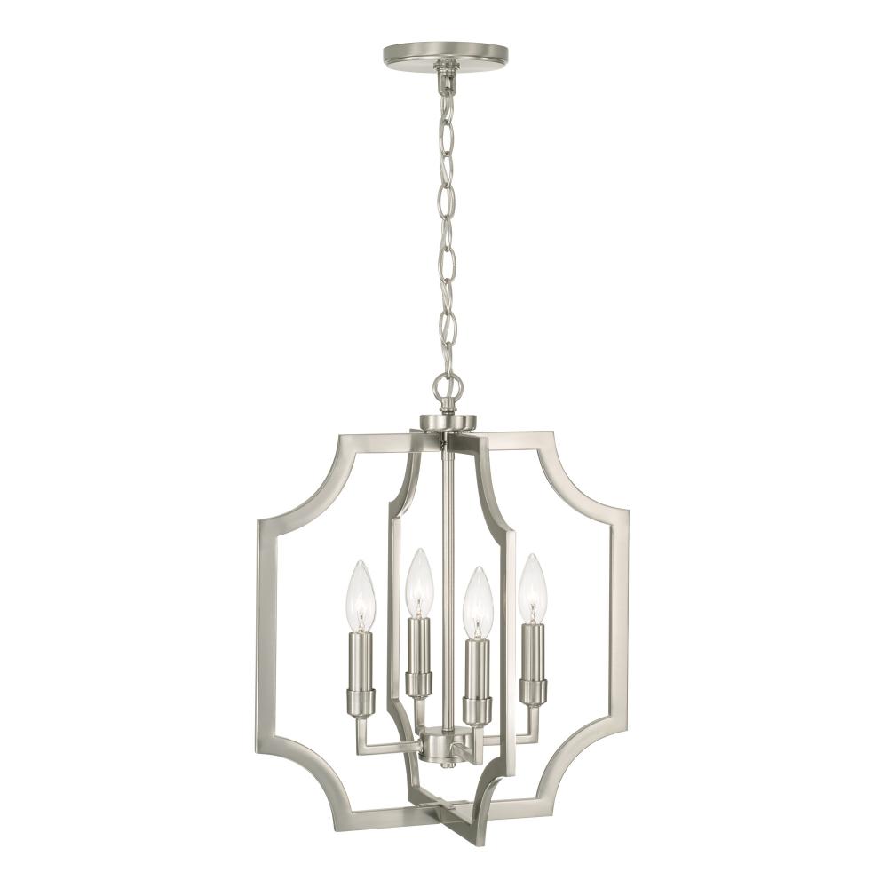 With the open, airy silhouette, the Courtney Lantern Foyer Pendant brings charming style that doesn't overpower. The curved corners add chic appeal, while the Brushed Nickel finish pairs seamlessly with any aesthetic.