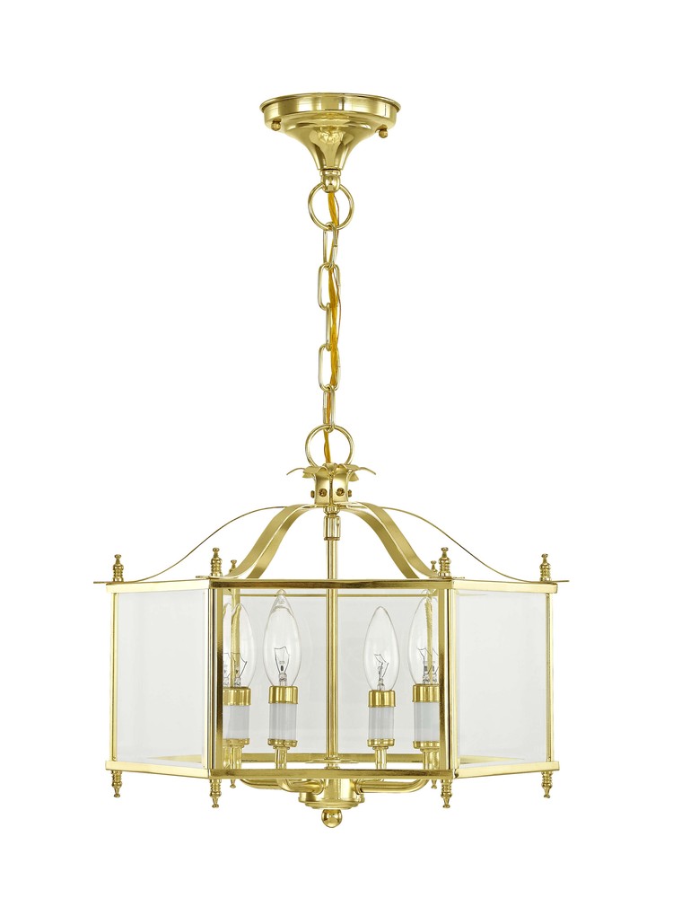 The Livingston Collection Features A Classic Six-Sided Lantern Silhouette. Polished Brass Finish With Clear Beveled Glass Gives The Fixture Charming Style And The Candelabra Bulbs Will Fill Your Home With Generous Amounts Of Illumination That Welcomes Your Guests. The Versatile Ixture Can Be Transformed Into Semi-Flush Ceiling Mounts.