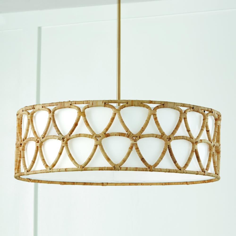 28"W x 19.5"H 4-Light Wide Pendant in Matte Brass with White Fabric Shade and Hand-Wrapped Natural Rattan