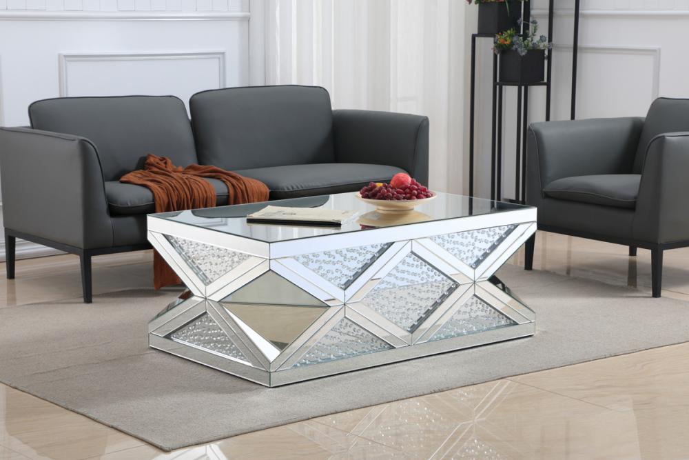 Glamourize your home and let your rooms sparkle with this coffee table exuding utmost elegance and modernity. The crisscrossing pattern creates an array of triangular and diamond shapes that has sparkling crystals embellished within clear class. The accent borders that creates the crisscrossing and top panels are all enveloped in clear beveled mirror panels that adds even more prestigious luxe. Host a dinner party and watch as your guests gather around this sparkling table with their glasses of wine and hors d’oeuvre, adorn it with fashionable magazines and important journals, inspire your guests with photography and textiles books—to put it simply, let this sparkling coffee table inspire conversations between you and your guests.
