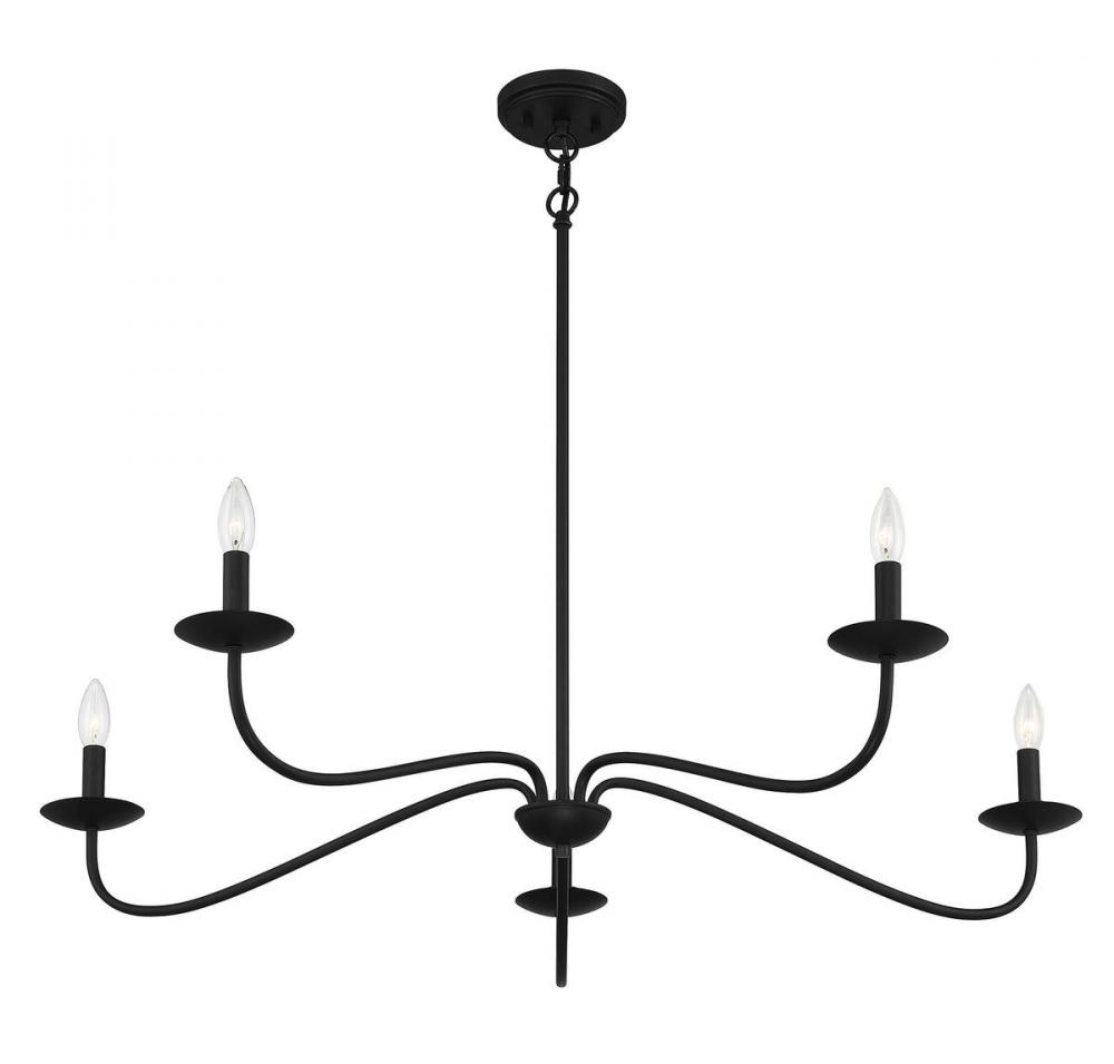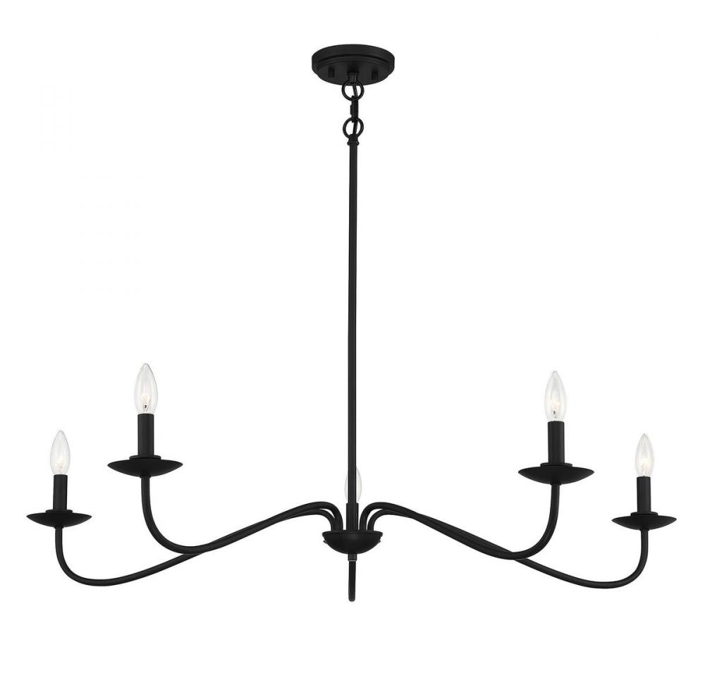 This Meridian 5-light chandelier makes a big statement with its long, dramatically curving arms and matte black finish. Use it to add a fresh new look to rooms with traditional, contemporary and even farmhouse decor styles! This chandelier is 7" in height and 42" in width, plus it includes four 12" downrods and one 6" downrod to let you adjust the height for a maximum of 61". This chandelier uses 5 candelabra size bulbs of up to 60 watts each, is LED compatible and is dimmable. You can use this chandelier on a sloped ceiling.