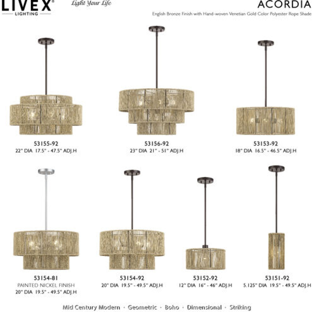 What a joy to come home to the calming, balanced and stylish Acordia lighting collection, with its semi-transparent texture and dynamic illumination! This midcentury modern lineup of elegant ceiling and wall lights features minimal metal frames with dimensional drum-shaped, tiered shades – masterfully handwoven with silky-smooth, highly-durable polyester rope, finished in noble, natural and atmospheric colors.
