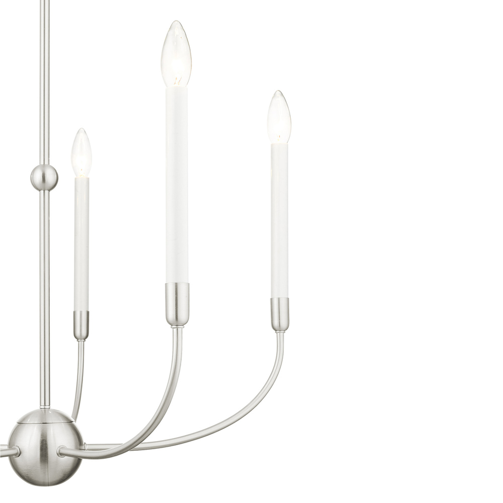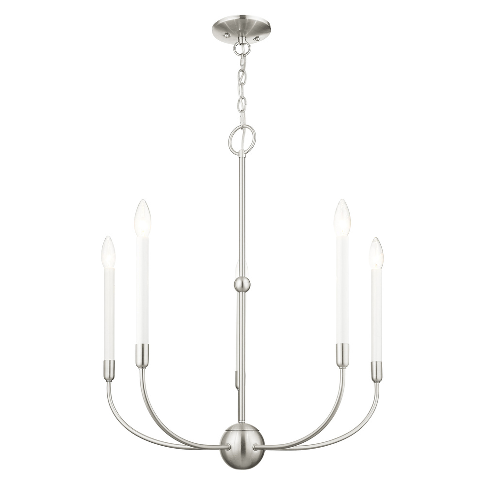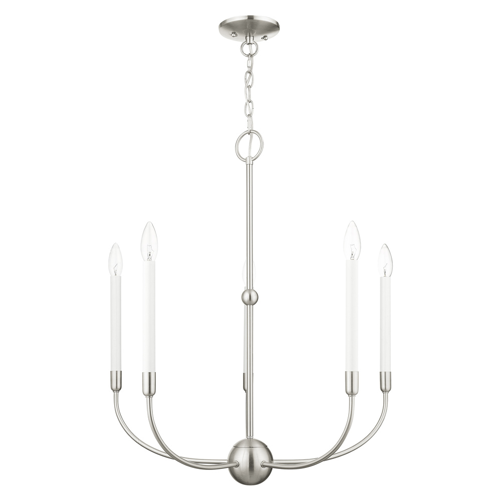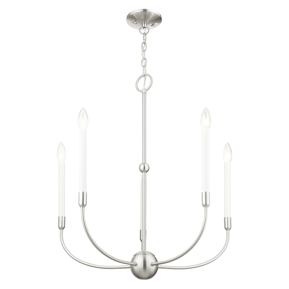 Updated traditional elegance and casual style defines the Lucerne collection. The curvilinear steel frame is offset by a brushed nickel finish. The essence of this collection amplifies today?s approach to a transitional style interior. This five-light chandelier will add a rustic and casual flare to your living room, dining room or kitchen.