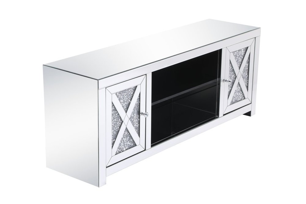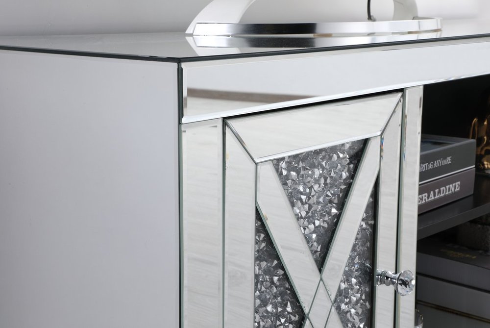 This mirror paneled tv stand is the perfect complement to your entertainment spaces. You can enjoy watching endless movies, host premier nights, or play video games until the stars are sparkling just as bright as the silver crystals that embellish the panels within the X-shaped details of the cabinet doors, which opens to reveal a storage area that is the perfect place to put away board games and various trinkets. Video game consoles and players can find a cozy spot in the middle storage area, or you can place books to read for when the tv is off. The perfect home for your tv, movies, and board games, this stand combines sparkling beauty with function.