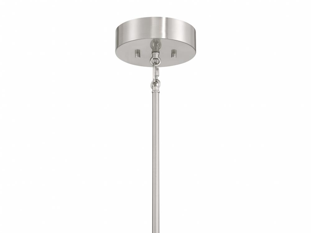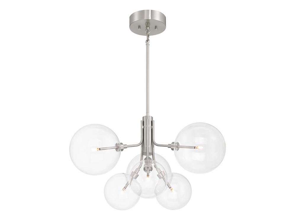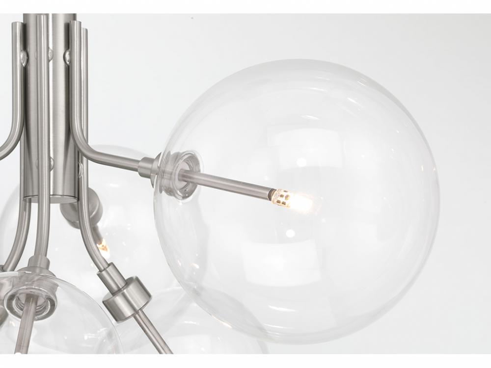 This 6-light chandelier has an effervescent look with its bubbles of clear glass atop short, sleek arms finished in Brushed Nickel. Small yet mighty LED bulbs are held within the bubbles to add even more sleekness. This chandelier is 26.75" in width and has an adjustable height ranging from 15.5" to 75.5". It uses six T4 size LED bulbs that are included. Comes with four 12" downrods and one 6" downrod.