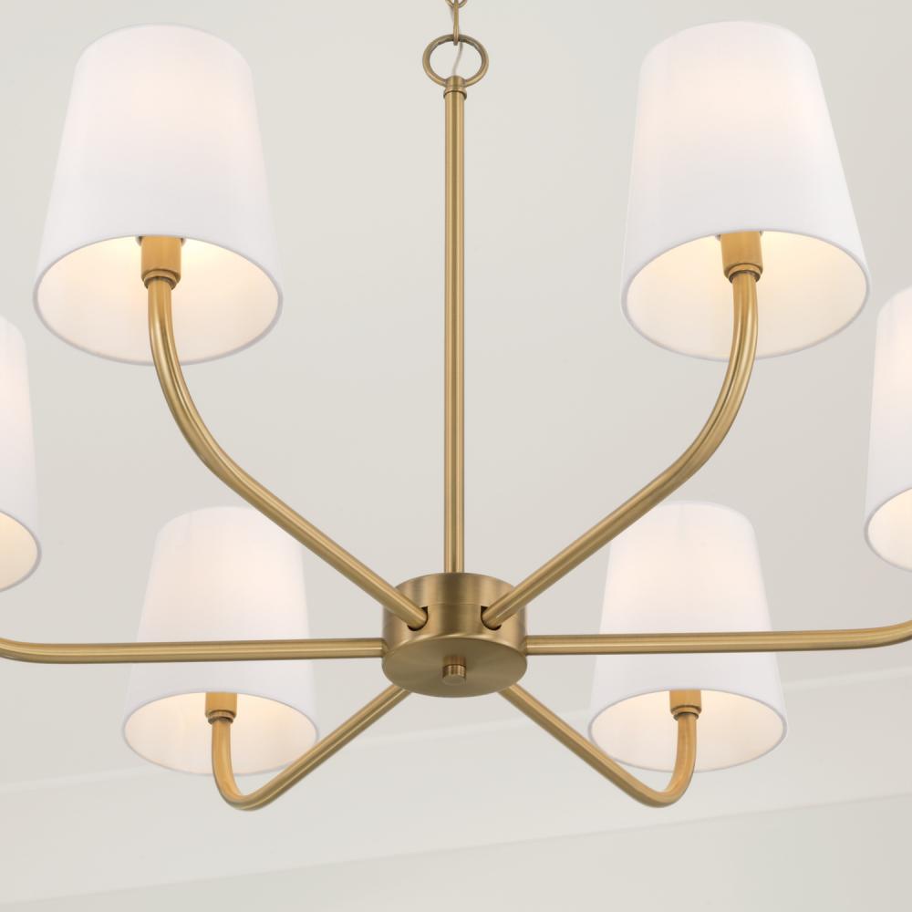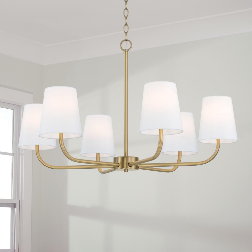 Embodying true minimalist form, the Brody Chandelier brings sleek, simplified style. The Aged Brass finish enhances the classic look of the white fabric shades to deliver sophisticated, less-is-more design. Available in two sizes.