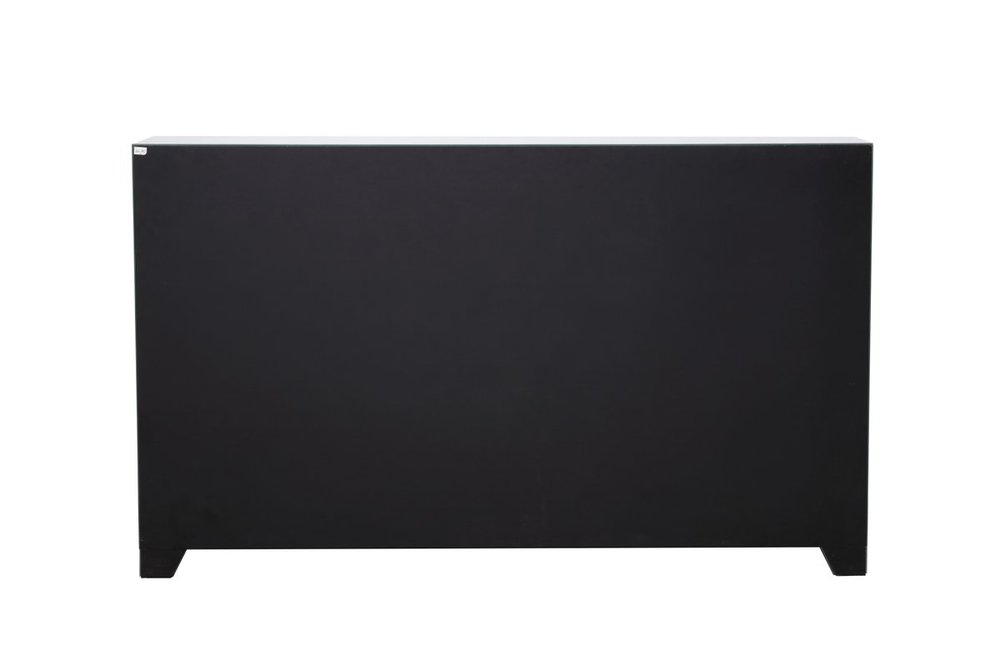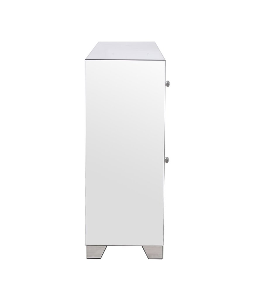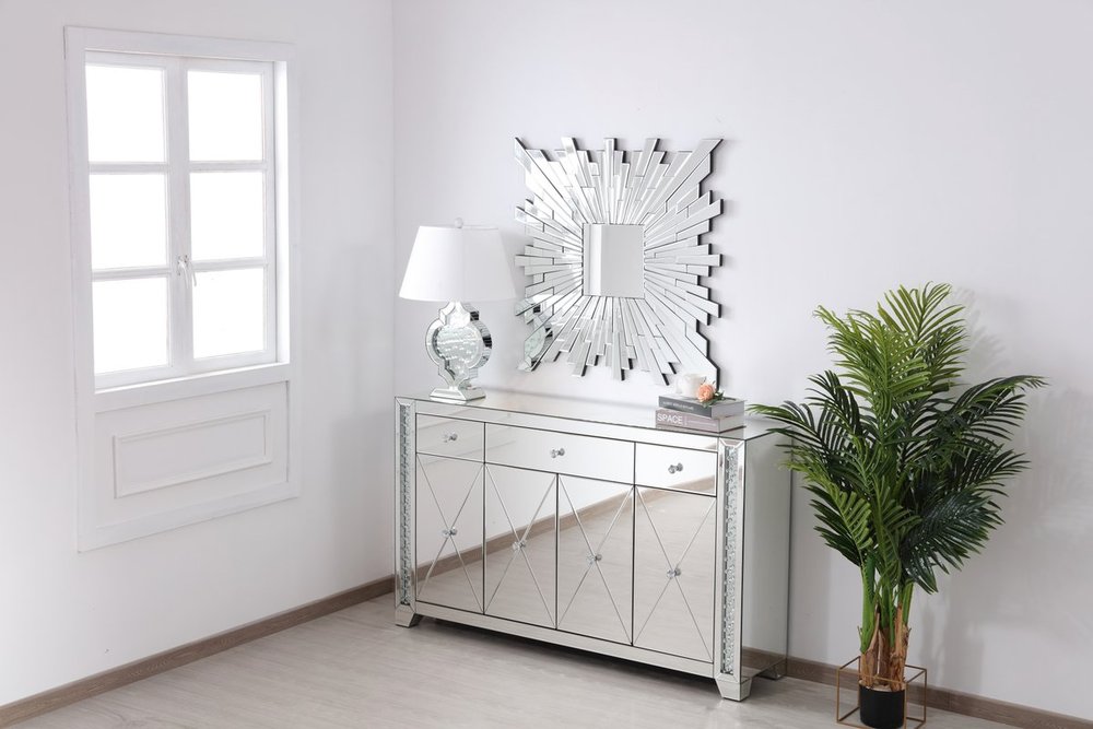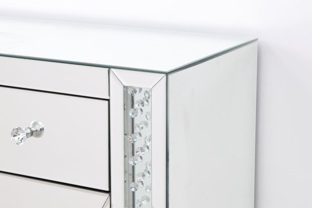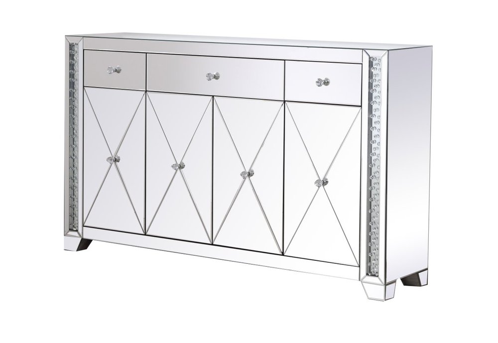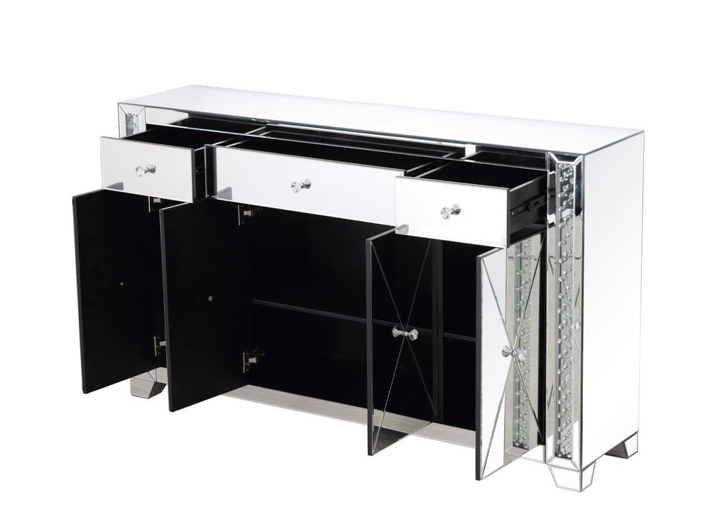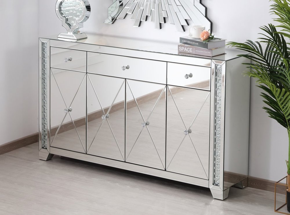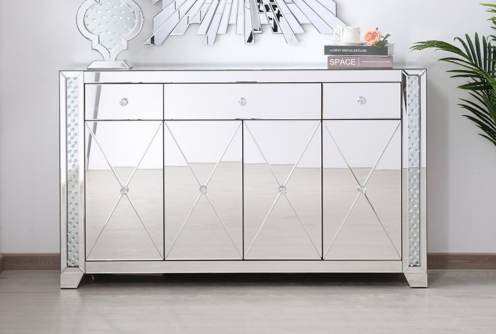 With 4 doors in bold criss-cross symmetry, measuring W60"xD14"xH36”, this modern credenza can decorate any dining room or narrow hallway and still yield plenty of storage space. With the gleaming beveled mirror surfaces and crushed diamond-like clear crystal inlay border, it opens up the visual space in the room while imbuing it with glamour. The jewel-like crystal door knobs exude sheer luxury. Fully assembled.