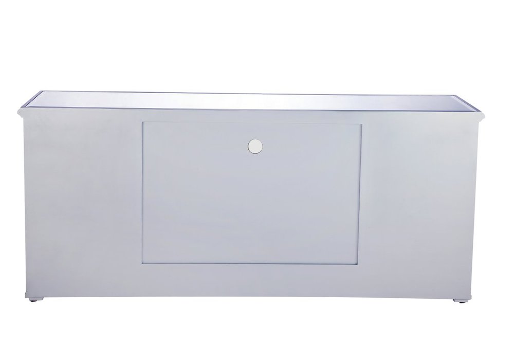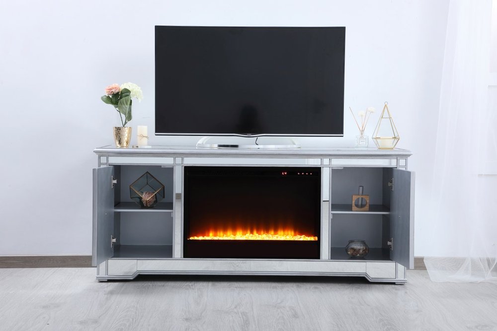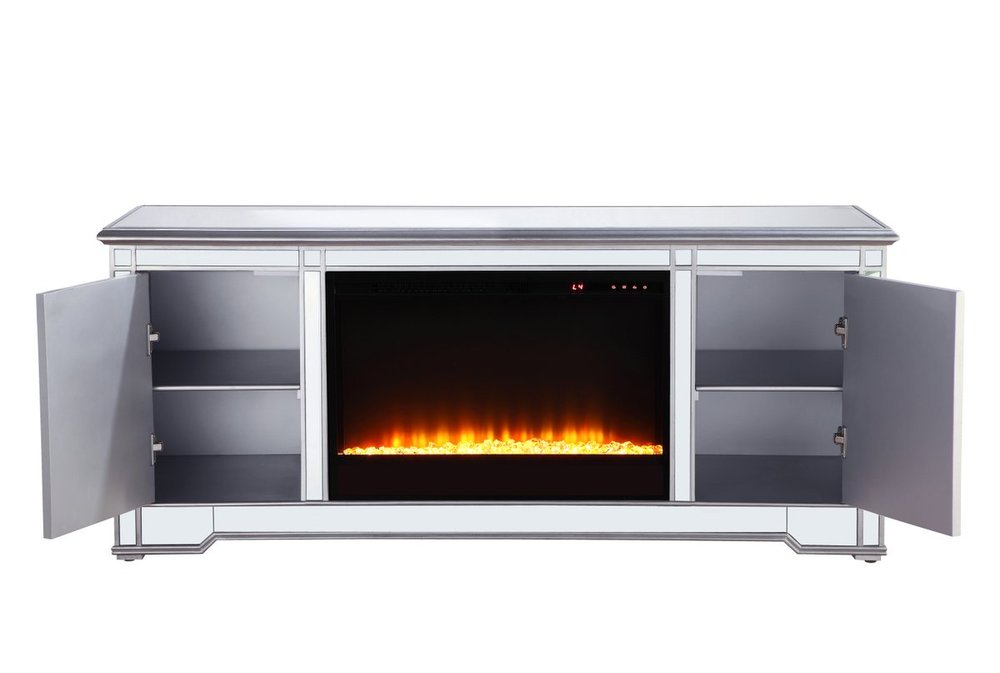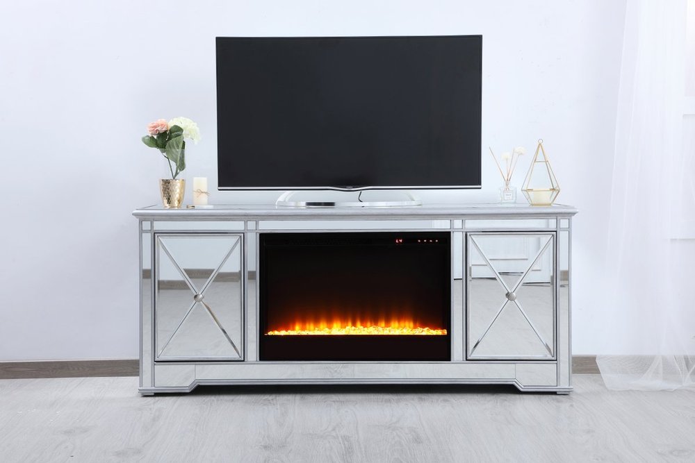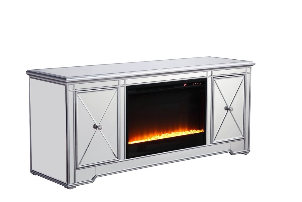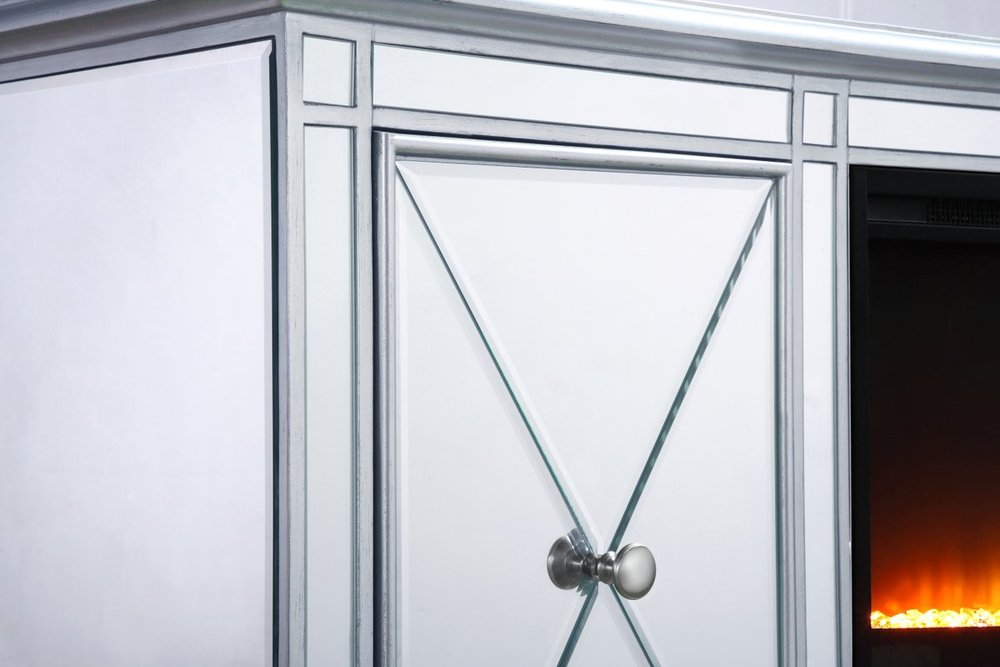 Sleek and vibrant, this classy media fireplace cabinet combo will make a striking statement in any room can showcase up to a 60" flat screen TV at a perfect height. Featuring gleaming criss-cross style mirror panel and hand-rubbed silver finish, brushed steel knobs. Functional and chic, with 2 soft-closing side doors. This includes the electric crystal fireplace insert that is easy to install into the cabinet. Beautiful crystals adorn the base of the fireplace. Set the mood with adjustable temperature and lighting settings.