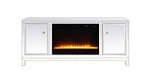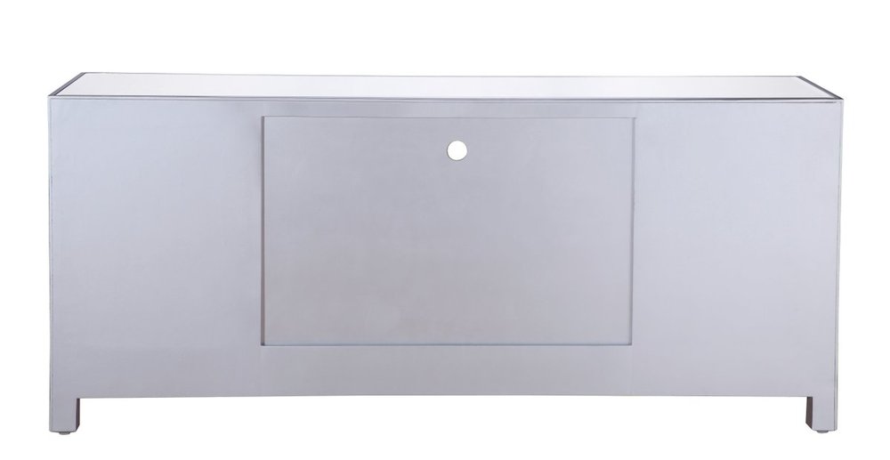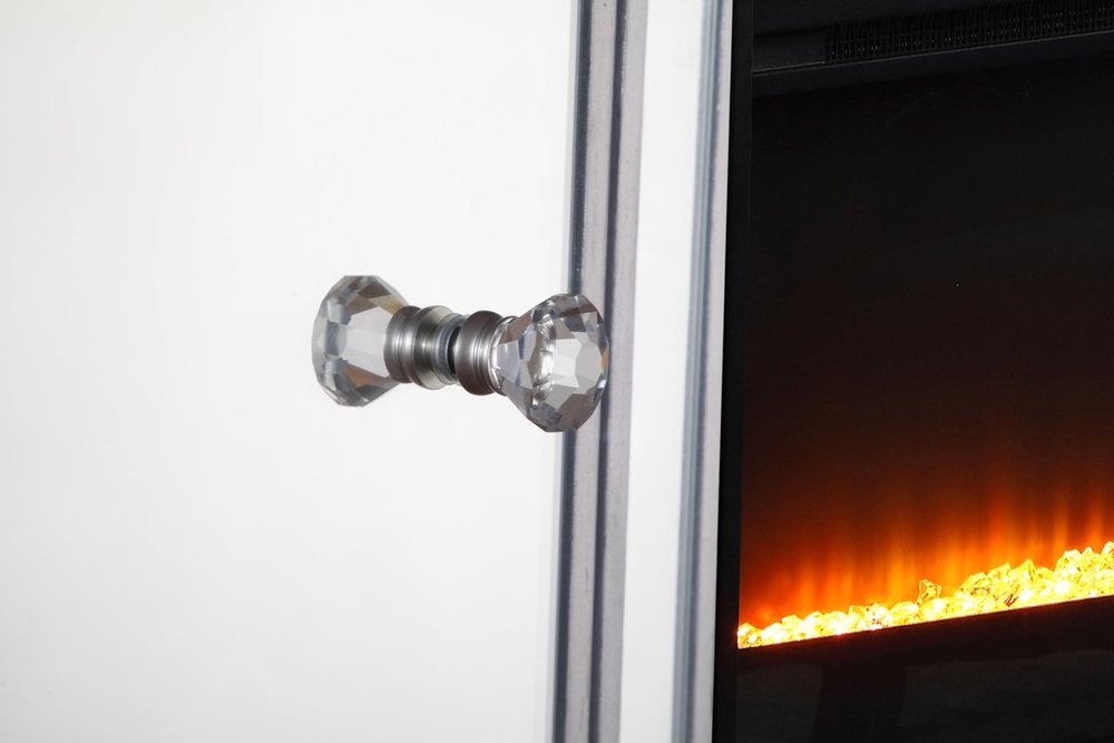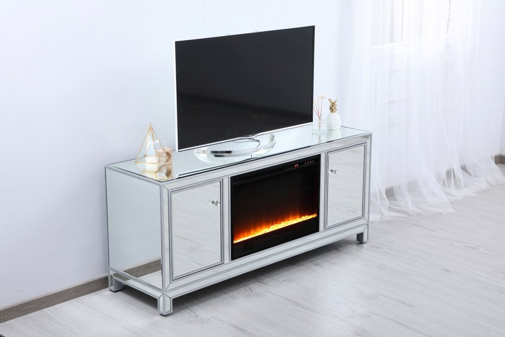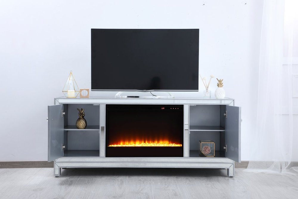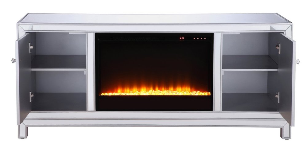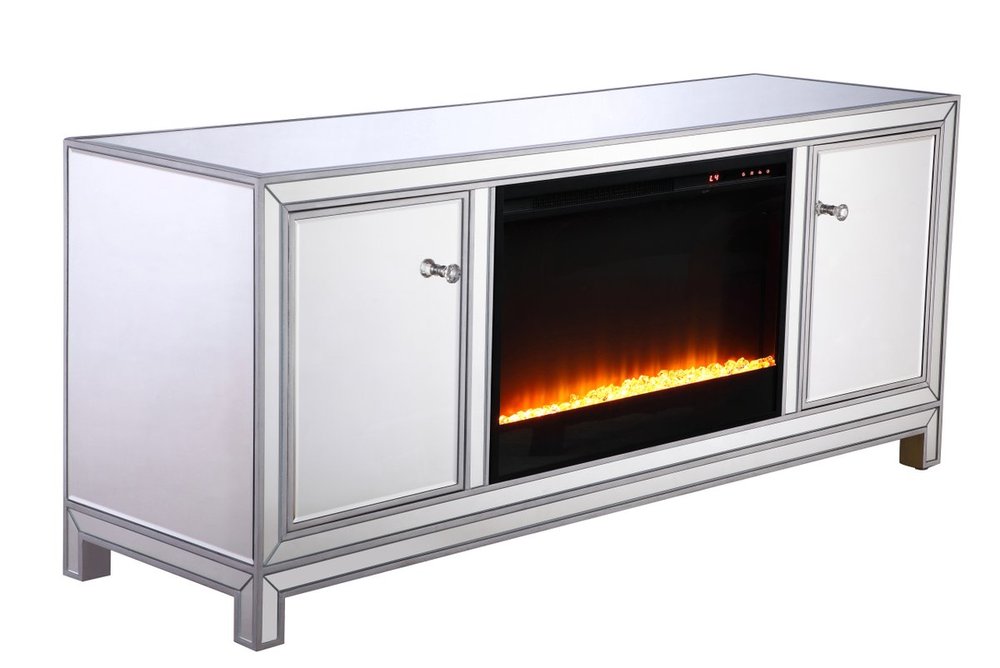 Sleek and vibrant, this classy media fireplace cabinet combo will make a striking statement in any room can showcase up to a 60" flat screen TV at a perfect height. Featuring gleaming criss-cross style mirror panel and hand-rubbed silver finish, brushed steel knobs. Functional and chic, with 2 soft-closing side doors. This includes the electric crystal fireplace insert that is easy to install into the cabinet. Beautiful crystals adorn the base of the fireplace. Set the mood with adjustable temperature and lighting settings.