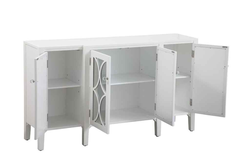 This white finish cabinet is demure luxury mixed with subtle charm. Delicate crystal knobs adorn the 4 cabinet doors, while the clear mirror panels, and the overlapping semi-circle design, adds a touch of glam and modern luxe. Whether a table lamp rests on the top, or you hide away trinkets within the storage space, this is the perfect accent to any room.