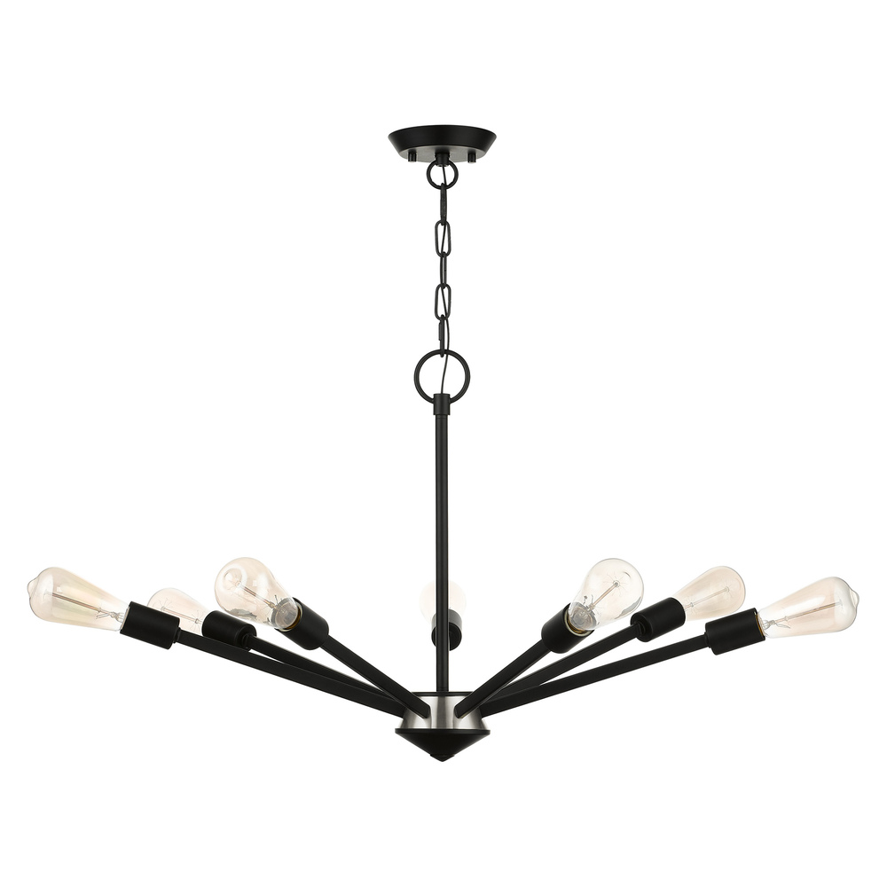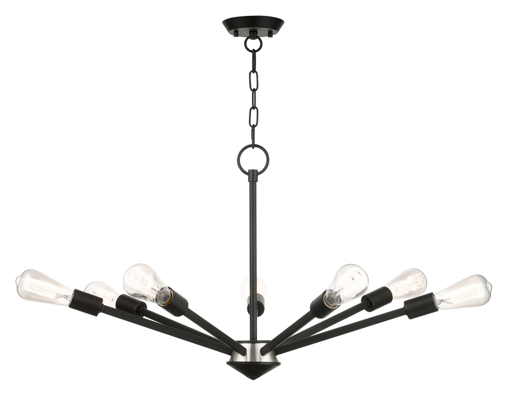 Add eye-catching lighting to your home decorating with the lively look of the Prague chandelier in black finish with a brushed nickel finish accent. This seven-light design features vintage style Edison bulbs that up the style factor, giving it an attractive, mid-century modern and industrial edge.