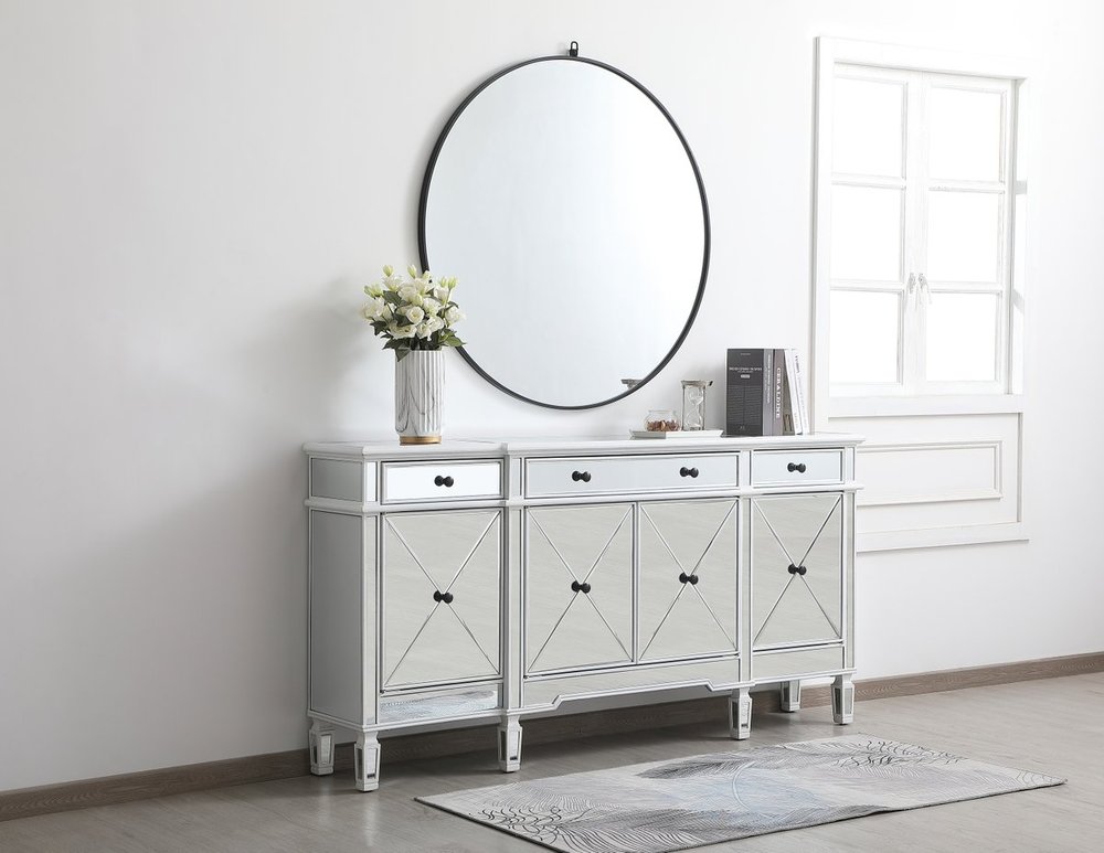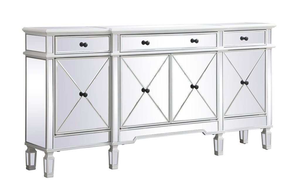 Make a striking statement with this gleaming mirrored credenza and live in the elegantly sleek future. Its contemporary style is defined by the alternating panels of polished beveled mirror panels. Its alternating panels that wrap around the entire cabinet creates an amusing design that everyone will enjoy and marvel at. Place this credenza in your home and adorn it with your favorite objects—captivating art pieces, beautiful floral arrangements, or even personal treasures like family portraits. Ships fully assembled with the exception of installing the legs.