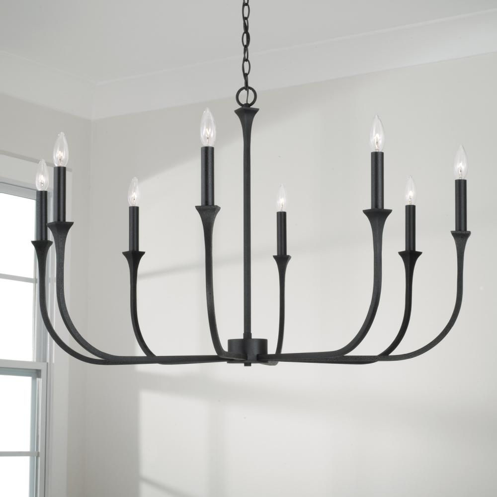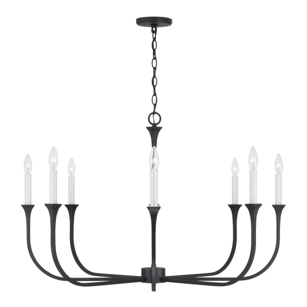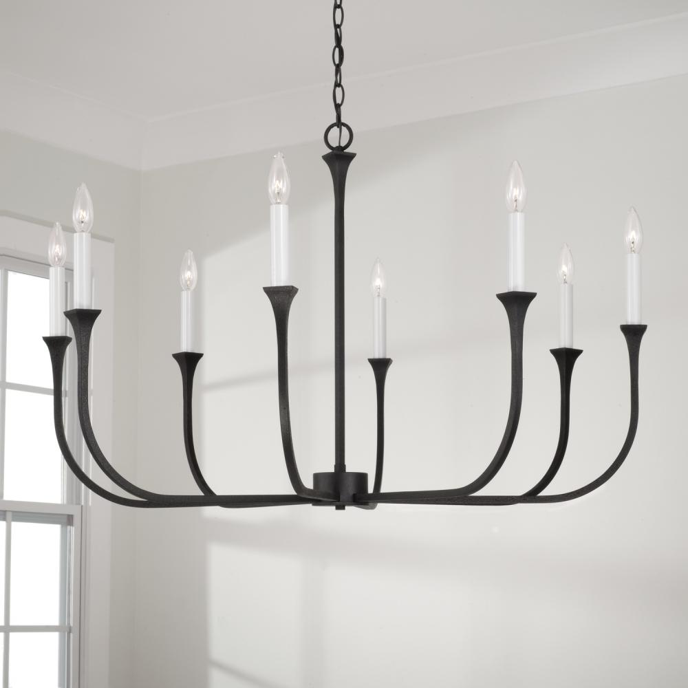 A timeless luminaire, the Decklan 8-Light Chandelier offers elegance with options. The textured Black Iron arms curve upward into flared bases for interchangeable candle sleeves – with both Matte White and Black Iron finishes included – to create tailored style in any space.