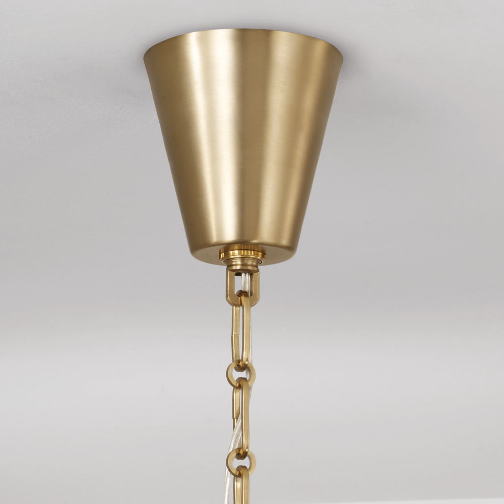 The Leland Large Chandelier exudes transitional design with bold and artful details. The wide lines bring structure to the classic silhouette, punctuated by tapered socket details and White fabric shades. This distinct luminaire is finished in Aged Brass and a unique designer canopy for timeless, elevated style.