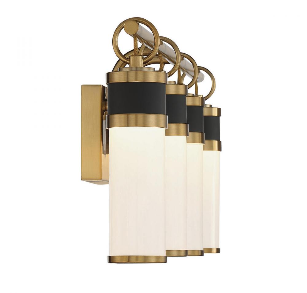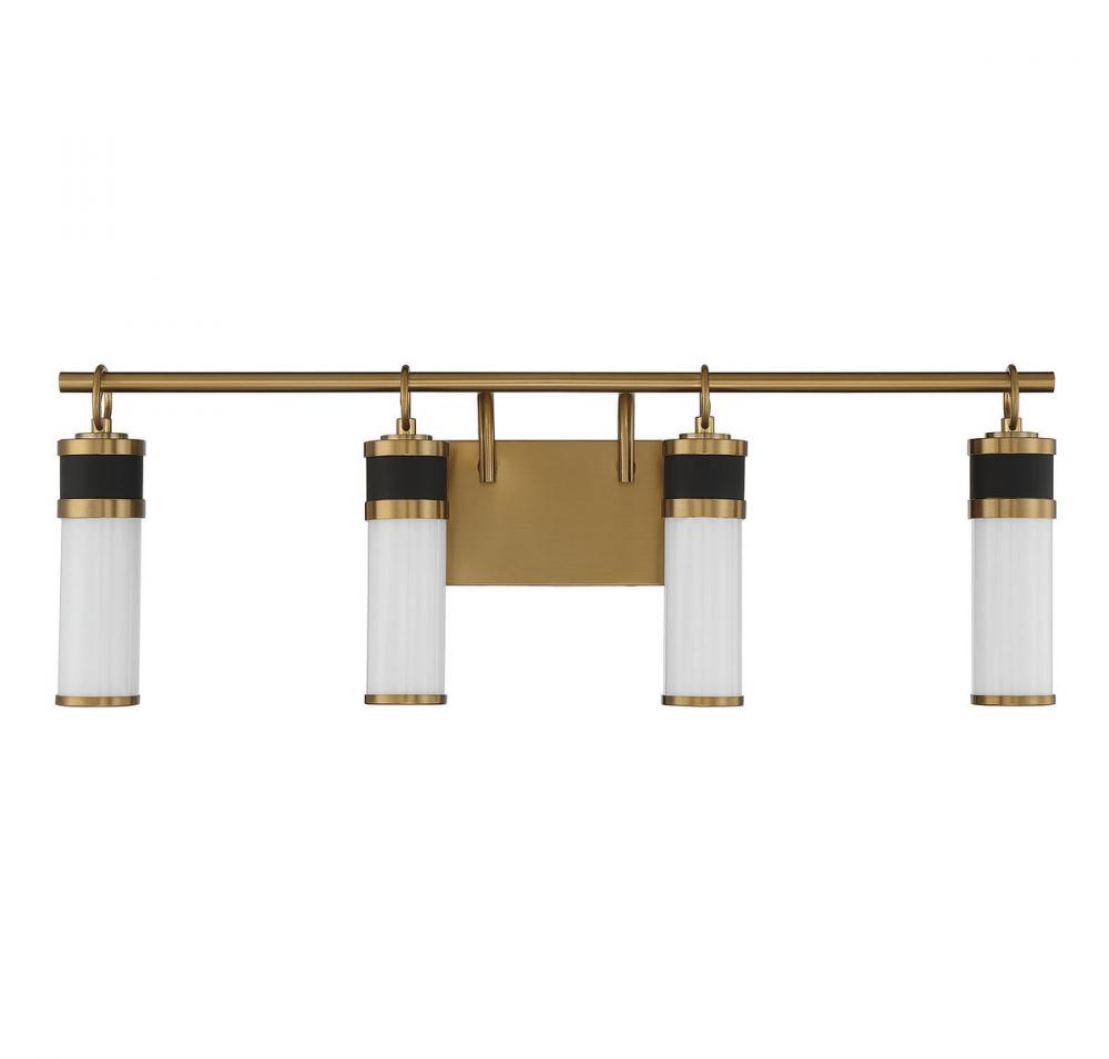 The Savoy House Abel 4-light bath vanity light flaunts a sleek and airy look that creates a robust presence in any space. Tubes of white opal glass are accentuated by ring accents and thoughtful hardware detailing in a rich combination of matte black with warm brass. Integrated LED light sources contribute to the sleek style. Abel is 10" in height, 30" in width and extends 5" from the wall. Damp area rated.