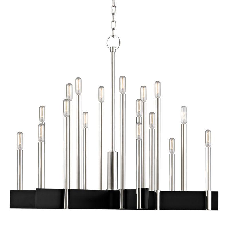 A stark work of minimalist sophistication, Abrams mounts elongated candlesticks of finely finished metal into wide black cross-pieces. These monolithic, textured black arms form a striking juxtaposition with the smooth, round candlesticks. Each arm, both on sconce and chandelier, contains a socket on either side. An exposed carbon-filament bulb is the natural choice for lamping, rounding the piece out.