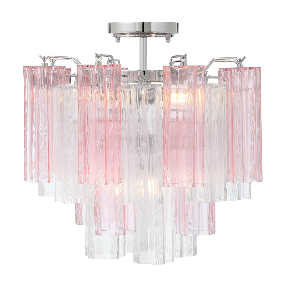 The captivating Addis Lighting Collection is a modern-day interpretation of the iconic mid-century Tronchi chandelier. Inspired by its predecessor's sleek lines and geometric shapes, the Addis features a polished Chrome or Aged Brass metal frame that exudes sophistication and style. Its unique design showcases transparent tiers of textured Tronchi glass tubes, forming a mesmerizing 5-point rounded star shape. Choose from a range of glass colors, including clear, amber, smoke, and white, or the stunning Autumn option, which features a captivating multicolor disposition of amber, clear, and smoke Tronchi glass. The Addis Lighting Collection offers various sizes and finishes, allowing you to find the perfect fit for your space while adding a touch of timeless elegance.