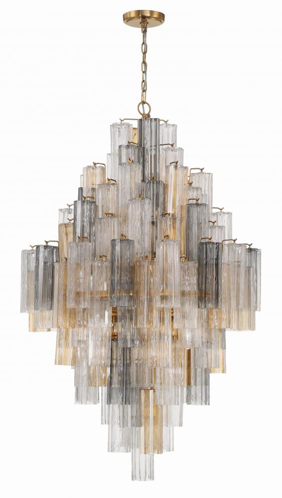 The captivating Addis Lighting Collection is a modern-day interpretation of the iconic mid-century Tronchi chandelier. Inspired by its predecessor's sleek lines and geometric shapes, the Addis features a polished Chrome or Aged Brass metal frame that exudes sophistication and style. Its unique design showcases transparent tiers of textured Tronchi glass tubes, forming a mesmerizing 5-point rounded star shape. Choose from a range of glass colors, including clear, amber, smoke, and white, or the stunning Autumn option, which features a captivating multicolor disposition of amber, clear, and smoke Tronchi glass. The Addis Lighting Collection offers various sizes and finishes, allowing you to find the perfect fit for your space while adding a touch of timeless elegance.