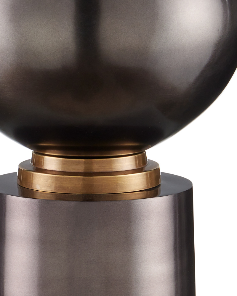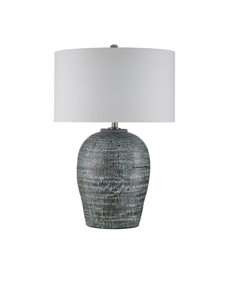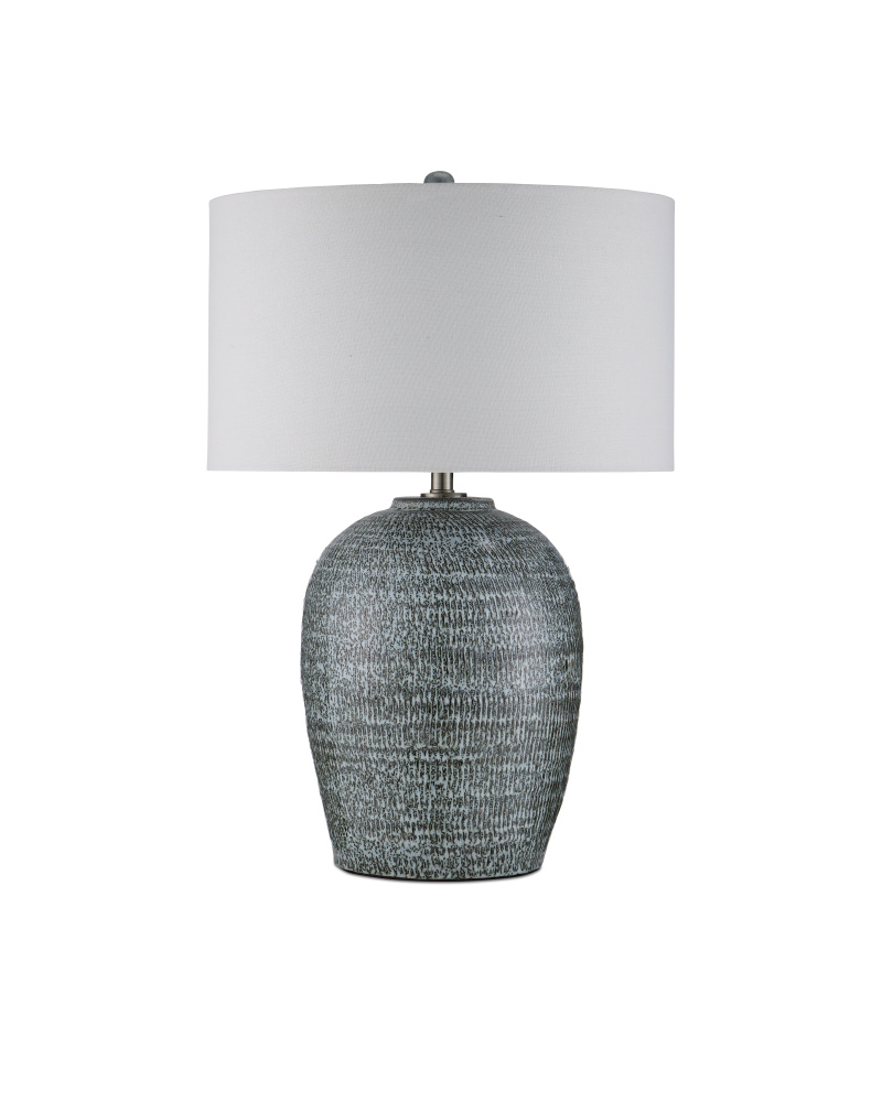 The Agatha Table Lamp is made of ceramic covered in a pattern that intermingles reactive black and white glazes, so the lamp could read as grayish or bluish in color depending upon the natural light in a space. The textural quality the striations bring the lamp’s body add a dynamic patina to a room.