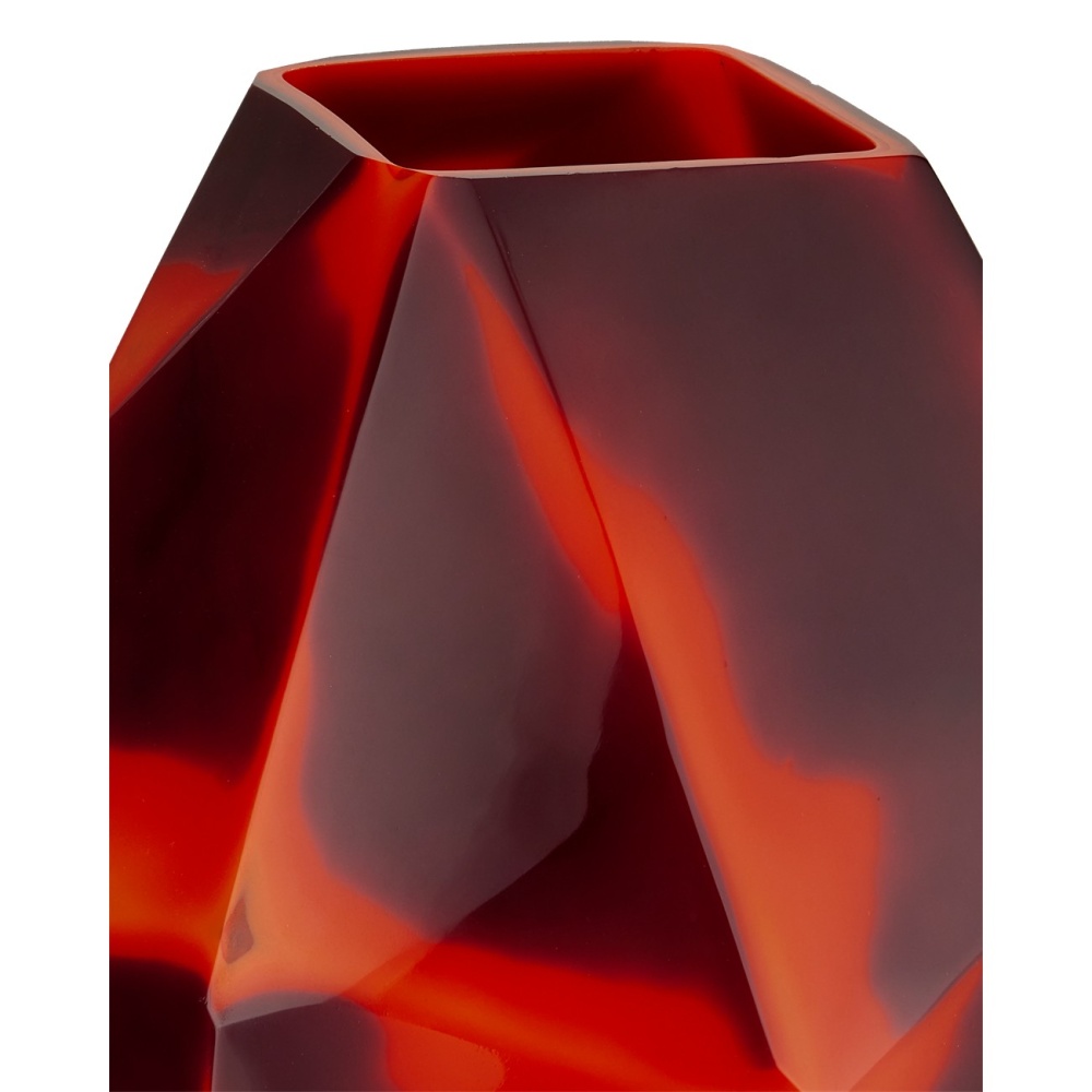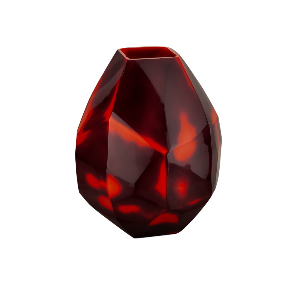 Like a cut diamond with a faceted form, the Akako Vase is a large mouth-blown glass vase with an angular profile. The vivid coral against the deeper color on its surface will make it a statement piece in an interior because it cannot help but glow. The red vase is quite large, so it is perfect for placing in a spot where it will dominate the vignette.