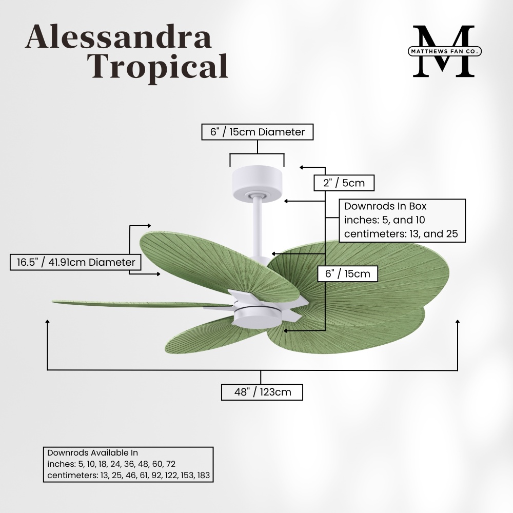 Minimal tropical form with maximum efficiency in 48". The thoughtfully crafted and versatile wet location Alessandra Tropical will complement any aesthetic and improve the health and comfort of any room. Highly customizable, the Alessandra Tropical is available in 5 different body finishes, 11 blade finish options and color changing light kit. Backed by a limited lifetime warranty, our fans are of the highest quality and will dutifully perform for years to come.