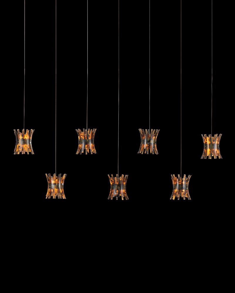 The shades of the Alsop Rectangular 7-Light Multi-Drop Pendant were inspired by tortoise shell bracelets that were popular during the era when Hollywood glamour was at its height. Made of composite with faux-horn surfaces, the shades on the brown pendant will be warm elements in a space. A refined aspect of the design is how the ribs arc outward and how they are staggered for greater texture than their surfaces bring. The canopy of this piece is luminous in a painted silver finish. This fixture is among Currey & Company's introduction of cluster lights, which includes multiple configurations.