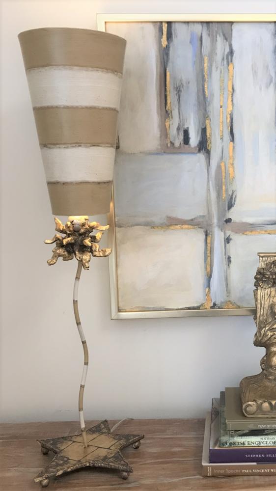 Our Flambeau inspired Anemone Buffet Lamp uses a hand-painted cylinder up-side-down shade that coordinates ivory and light taupe stripes to bring a traditional and transitional, look to this striking Table Lamp. The Transitional design of this sophisticated collection focuses on the neutral colors and the striped finishes which adds a little whimsical vibe to our design. The shade is 9" in diameter at the top, and tapers down. The painted and glazed metal star shaped base has a diameter of 10 Inches which works great in a nursery, restaurants and office nooks. This fun and modern buffet table lamp is a beautiful choice for a dining sideboard as well. The design is accented with gold leaf elements that accentuates the Charming design flair while delivering romantic lighting.
